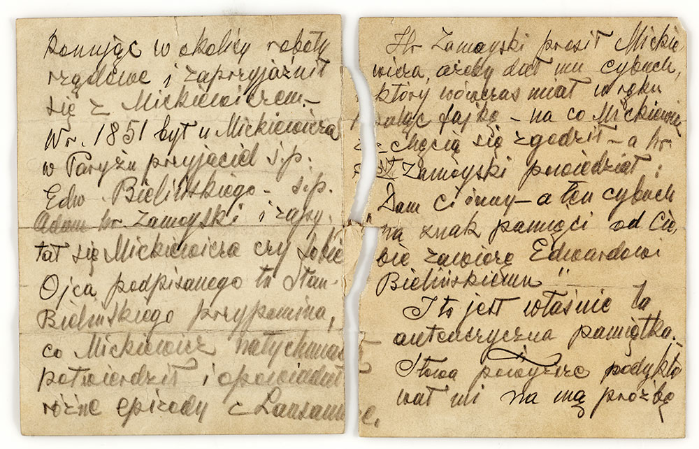 Niepozornie wyglądający patyk wydrążony w środku stanowił niegdyś zasadniczą cześć długiej fajki, którą palił Mickiewicz. W 1851 roku poeta podarował ją swojemu znajomemu Edwardowi Tadeuszowi Bielińskiemu (1795–1864), powstańcowi listopadowemu odznaczonemu za swe bohaterstwo Złotym Krzyżem Orderu Virtuti Militari.