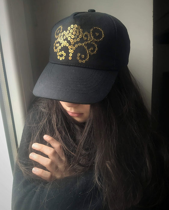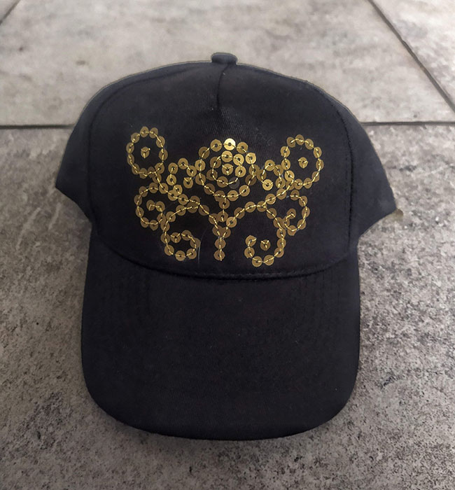 Choć wizja uszycia czepca wydaje się być kusząca, na razie nie jestem jeszcze gotowa na podobną ekstrawagancję. Wybrałam drogę na skróty. Naszyłam cekiny na zwykłą czapkę z daszkiem. Wykorzystałam złote cekiny wyprute ze starej sukienki oraz złotą nitkę.