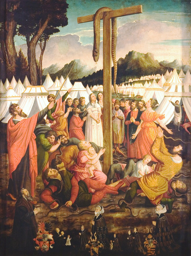 W scenie głównej prezentowanego malowidła widoczne są jadowite węże kąsające na pustyni Izraelitów. Przed ich jadem chronić ma „wejrzenie” na węża miedzianego wywyższonego przez Mojżesza, tak jak wiara w ukrzyżowanego Chrystusa chroni przed wieczną śmiercią. Jakoś jednak przypomniało mi się teraz, że w mitologii greckiej za takie zarazy odpowiadał Apollo. To on zsyłał węże, m.in. te, które udusiły kapłana Laokoona, i on swoimi strzałami uśmiercił dzieci dumnej Niobe, on odpowiadał za zarazę wśród oblegających Troję Greków. Natomiast syn Apolla Eskulap/Asklepios, wychowany przez centaura Chirona, był lekarzem najznakomitszym (nawet wskrzeszał tych, którzy zmarli), a pokazuje się go w sztuce z laską oplecioną przez węża, od którego zdobył cudowne ziele przywracające życie. Laska Eskulapa z wężem to dziś symbol medycyny, za której sukcesy i za której pracowników dziś trzymamy kciuki.