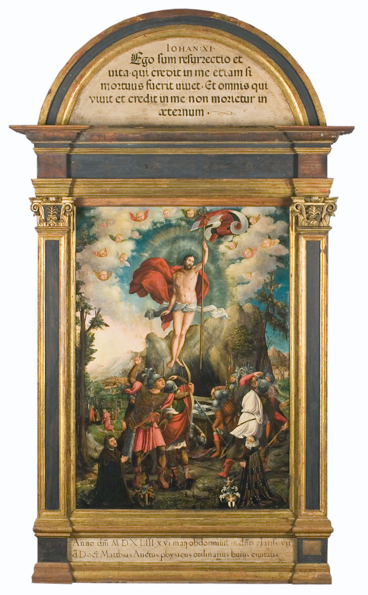Oba wizerunki małżeństwa Przybyłów po otwarciu muzeum będziecie mogli zobaczyć w upamiętniającym ich epitafium na wystawie „Sztuka śląska XVI–XIX w.” w Gmachu Głównym, a na razie musicie zadowolić się niewielką fotografią. Głównym tematem malowidła jest Zmartwychwstanie. Pilnujący grobu żołnierze są właśnie świadkami cudownego wydarzenia i zaskoczeni obserwują unoszącego się nad otwartym grobem Chrystusa. Można tam jeszcze wypatrzyć po lewej trzy inne scenki: Marię Magdalenę wracającą od pustego grobu, Trzy Marie, które idą namaścić ciało Chrystusa oraz motyw tytułowany Noli me tangere (Jan 20, 11-18) – Maria Magdalena rozpoznaje w ogrodniku zmartwychwstałego Chrystusa.