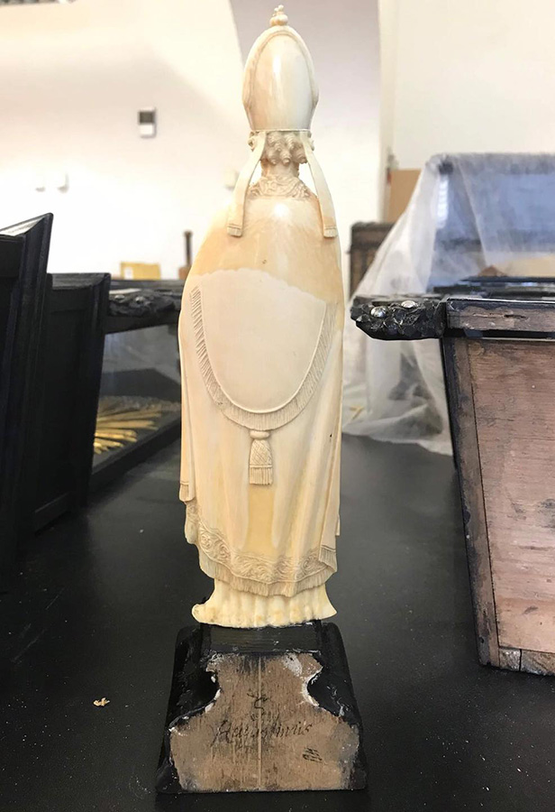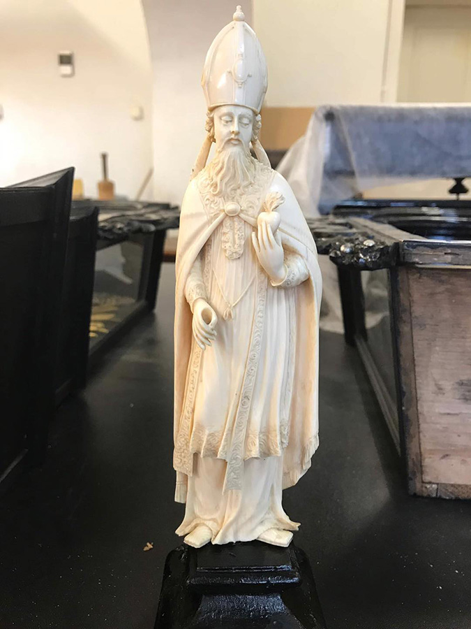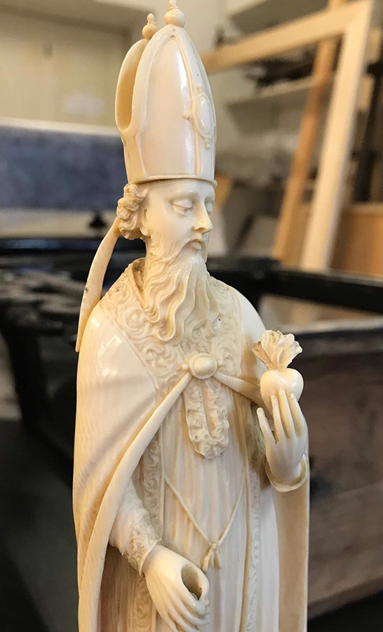 Płonące serce trzymane przez św. Augustyna to detal figurki z kości słoniowej, którą w prezencie od papieża otrzymała najmłodsza wnuczka Jana III Sobieskiego – Maria Klementyna Stuart.