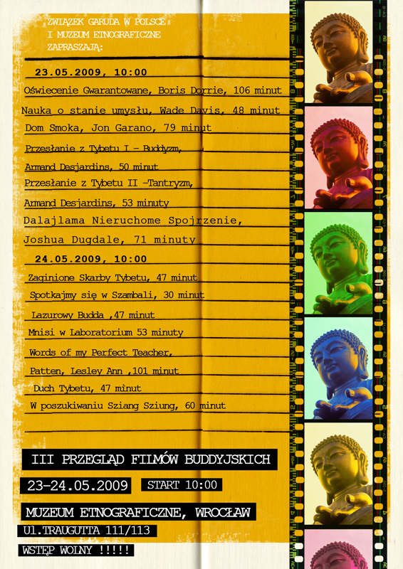 Związek Garuda w Polsce, Tradycji Yungdrung Bon, wspólnie z Muzeum Etnograficznym zapraszają na kolejny, trzeci już przegląd filmów buddyjskich, podczas przeglądu będzie można zobaczyć klasyczne filmy dokumentalne o tematyce tybetańskiej, komedie i filmy o tym jak współczesna nauka i buddyzm spotykają się w laboratoriach naukowców.