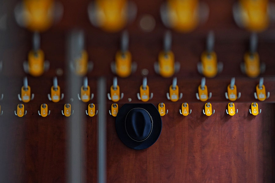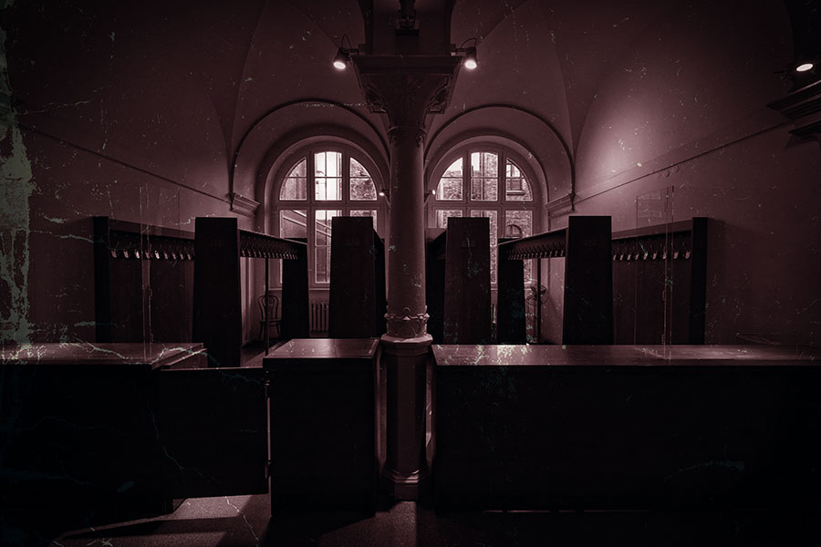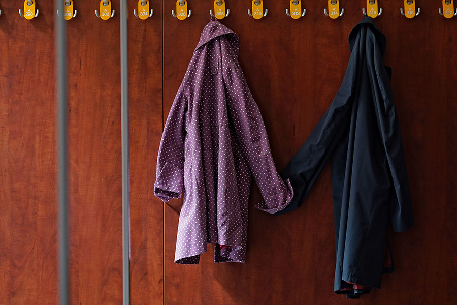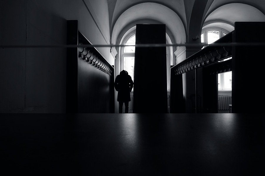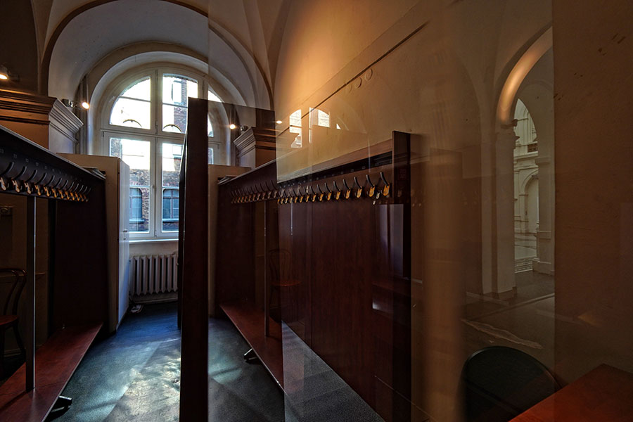 Szatnia to pomieszczenie przeznaczone do przechowywania nakrycia wierzchniego zwiedzających. Kilka haczyków wbitych w deskę, lustro i lada. Można pomyśleć, że na tym się kończy definiowanie tej monotonnej przestrzeni.