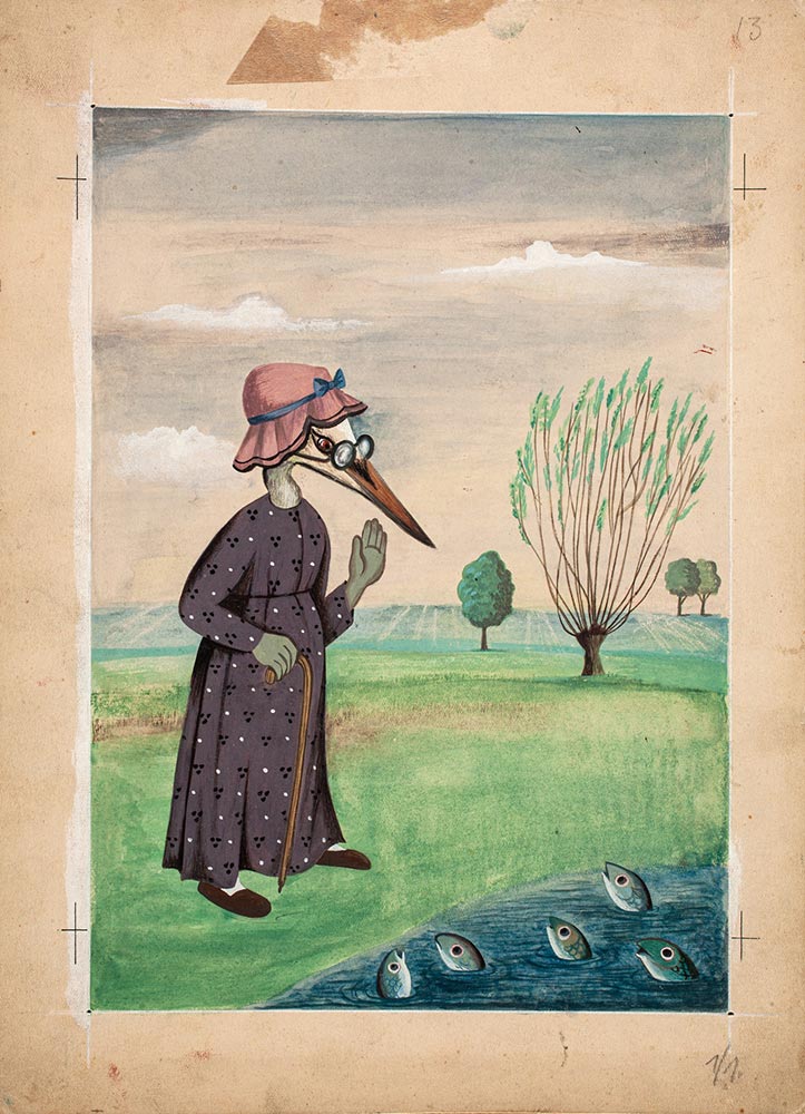 Przygotowując wystawę „Ha-Ga. Życie towarzysko-rysunkowe”, której otwarcie planowane jest na 24 października 2025 r. w Muzeum Karykatury im. Eryka Lipińskiego w Warszawie, poszukiwałem dokładnej daty odsłonięcia w Legnicy w Alei Gwiazd Satyrykonu tablicy poświęconej Annie Gosławskiej-Lipińskiej. Zdjęcie tablicy, które pojawiło się jako jedna z pierwszych odpowiedzi w wyszukiwarce, przekierowało mnie na stronę Muzeum Narodowego we Wrocławiu do zakładki „Intrygujące!” poświęconej muzealnym ciekawostkom i odkryciom związanym ze zbiorami Muzeum Narodowego we Wrocławiu. Wizyta na tej stronie okazała się autentyczną sensacją, ponieważ zawierała informację, że oryginalne projekty ilustracji Ha-Gi do „Bajek” Jeana de La Fontaine’a znajdują się w kolekcji MNWr. Kolejny zachwyt wzbudziły we mnie fotokopie tych projektów: oryginały urzekają żywą kolorystyką i ogromnym kunsztem ich wykonania, których nie oddają wydrukowane w książce kompozycje. Natychmiast podzieliłem się tym niezwykłym odkryciem z córką Ha-Gi – Zuzanną Lipińską – która podczas naszych rozmów o matce wielokrotnie powtarzała, że ilustracje do „Bajek” były jednymi z ulubionych jej realizacji, ale niestety nie ma pojęcia, gdzie mogą znajdować się oryginały. Dzięki cyklowi „Intrygujące!” wiemy już, że znalazły się w dobrych rękach i zyskały odpowiednią opiekę.