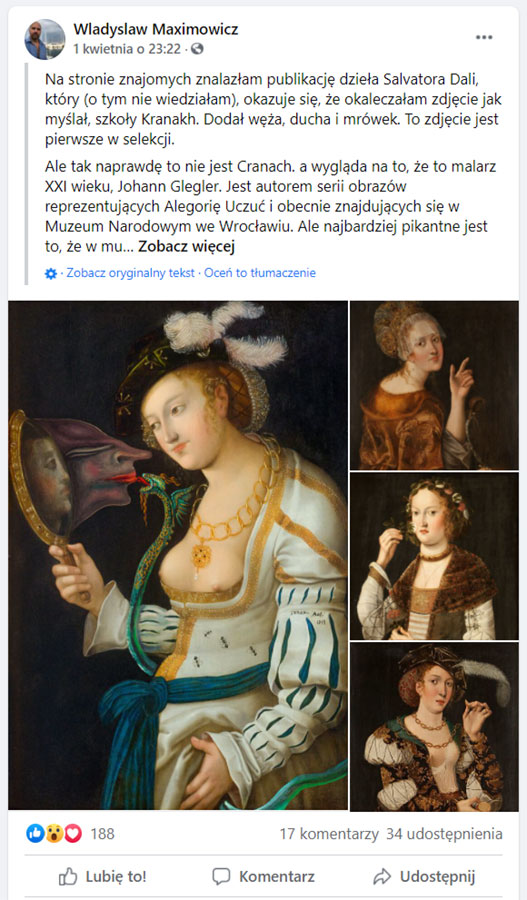 Zatem nie lada sensacją należy nazwać to, co 1 kwietnia 2021 r. opublikował na swojej stronie FB działający w Bratysławie marszand sztuki Wladyslaw Maximowicz ➸, który – a to wydaje się wielce prawdopodobne – w jednym z obrazów Salvadora Dalí z 1974 r. wskazał kolejną „naszą” Alegorię Zmysłu – brakującego właśnie w naszej serii Wzroku