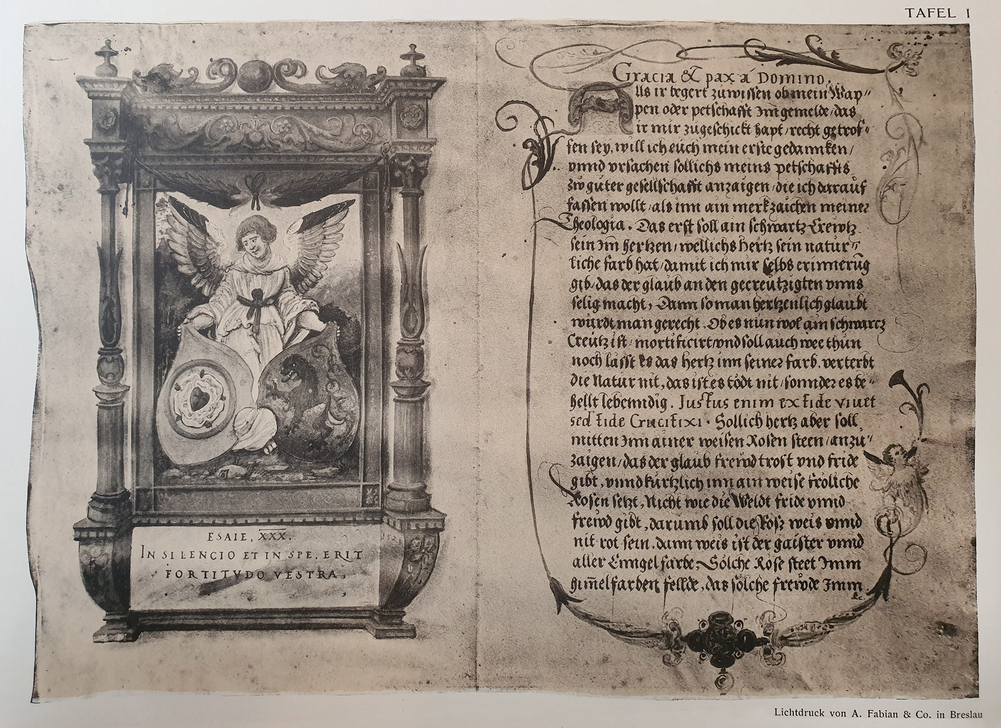 Pierwsza miniatura zawiera w centralnym polu epitafijnego obramienia przedstawienie anioła z dwoma herbami: Marcina Lutra i Katarzyny von Bora. W prawicy trzyma on błękitną tarczę z białą różą o zielonych listkach w złotej obręczy, w centrum ma czerwone serce z czarnym krzyżem. Lewą dłonią anioł przytrzymuje tarczę z czerwonym lwem stojącym na tylnych łapach. W dolnej części znajduje się ulubiony cytat reformatora z Księgi Izajasza: „XXX: IN SILENCIO ET IN SPE, ERIT / FORTITUDO VESTRA” (W ciszy i nadziei będzie wasza siła). Obok miniatury przytoczony został list Marcina Lutra z ortografią norymberską. Opisano w nim, jak należy prezentować jego herb i jakie wyraża treści. Choć miniatura przedstawia herby małżonków, w liście brak informacji na temat herbu Katarzyny von Bora. Stąd wniosek, że miniatura nie jest odpowiedzią na zamieszczony przy niej list Lutra. Miała ona natomiast związek z Lazarusem Spenglerem, adresatem listu, duchowym przywódcą reformacji w Norymberdze. Jego herb bowiem dwukrotnie pojawia się na omawianych tu pracach.