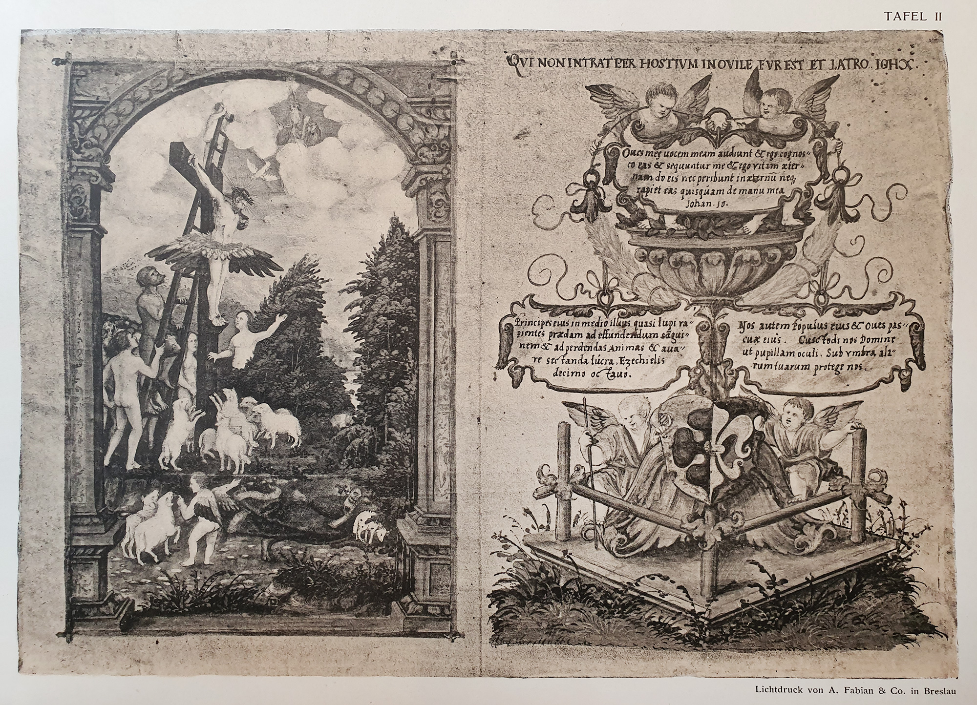 Druga z miniatur przedstawia śmierć Chrystusa na krzyżu jako drabinie do niebios w architektonicznej arkadzie. W typowo protestanckim ujęciu zawiera przedstawienia Adama i Ewy oraz owiec trzody Pańskiej. Obok zapisane są komentarze tekstowe z Ewangelii św. Jana, Księgi Psalmów i Księgi Kapłańskiej. Umieszczono je na kartuszach wkomponowanych w bogato zdobiony kielich. Ponad nim znajduje się inskrypcja główna z Ewangelii św. Jana „QVI NON INTRAT PER HOSTIUM IN OVILE FVR ET LATRO. IOH X” (Kto nie wchodzi do owczarni przez bramę, jest złodziejem i rozbójnikiem). Na stopie kielicha widnieje podtrzymywany przez dwa aniołki herb z połową czerwonej róży i połową srebrnej lilii na czerwonym tle. Herb ten pojawia się także na trzeciej miniaturze pod wierszem w obramieniu florystycznym z aniołkami.
