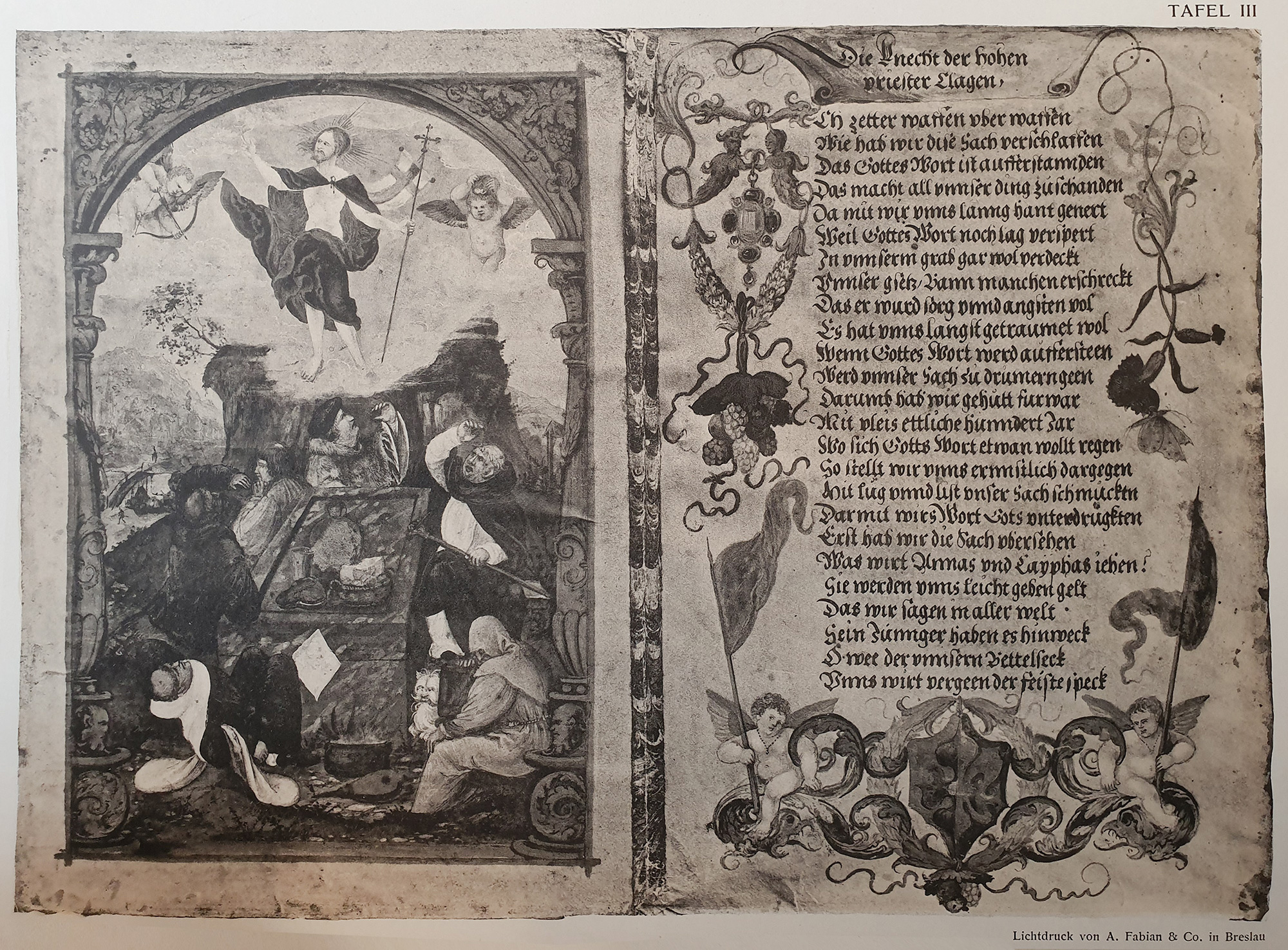 Obok znajduje się scena zmartwychwstania w architektonicznej arkadzie. Chrystus w czerwonym płaszczu i z chorągwią rezurekcyjną unosi się ponad sarkofagiem w glorii jako zwycięzca śmierci. Miniatura ta, podobnie jak poprzednia, ma wiele elementów polemiki z papiestwem, m.in. w roli strażników grobu występują mnisi i kler. Przedstawienie to komentuje zamieszczony obok wiersz pod tytułem Die Knecht der hohen priester Clagen (Słudzy najwyższych kapłanów skarżą się), który – tak jak pozostałe teksty – ma styl piśmiennictwa bawarsko-frankońskiego z XVI w.