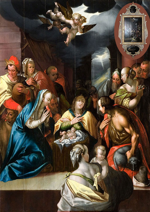 Wzorem dla obrazu był pochodzący z 1592 r. miedzioryt Johannesa I Sadelera według Hansa von Aachen. Rzeźbioną ramę z wolutami, motywami roślinnymi i okuciowymi marmoryzowano w odcieniu szaro-zielonkawym, ze złoceniami oraz laserowanymi srebrzeniami.