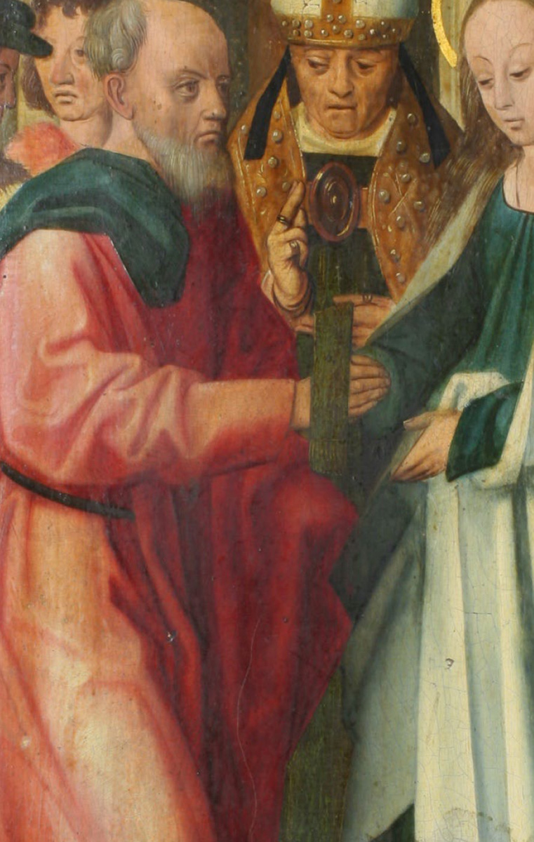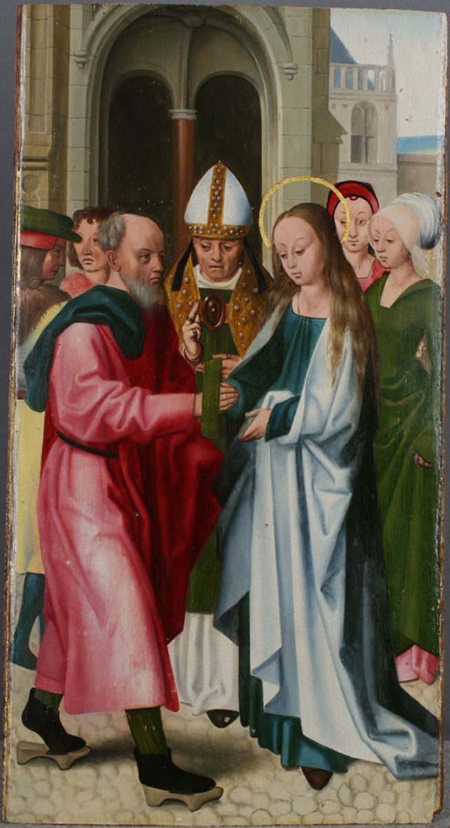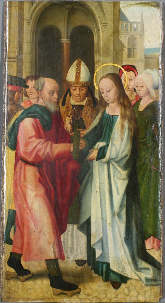 Maria ubrana jest w sięgającą ziemi niebieską suknię i biały płaszcz bez żadnych zdobień. Ma rozpuszczone jasne włosy sięgające pasa. Po stronie lewej stoi Józef, ukazany tu jako starszy, łysiejący mężczyzna z siwymi włosami i brodą. Ubrany jest w czerwoną szatę przepasaną sznurem, niebieska draperia na jego ramieniu to pewnie płaszcz. Na nogach ma zielone nogawice, czarne buty i drewniane patynki. Udzielający ślubu kapłan przedstawiony jest jako biskup w białej tiarze na głowie, w albie, zielonej tunice i złotej kapie. Za Marią stoją dwie młode kobiety. Za plecami Józefa widocznych jest dwóch mężczyzn. Grupa postaci stoi na jasnożółtym bruku. Za nimi znajduje się łukowato zamknięty portal z widocznym w głębi krzyżowo-żebrowym sklepieniem i podtrzymującą je kolumną. Po prawej stronie ukazany jest fragment architektury, schematycznie zaznaczony odległy horyzont, a nad nim jasne, niemal białe niebo.