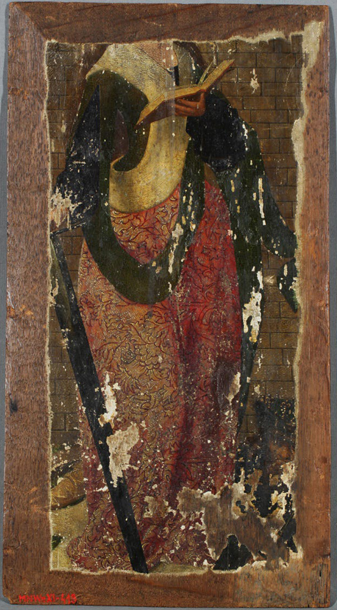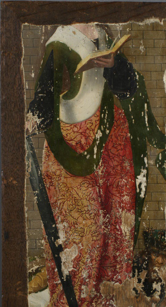 Obraz na rewersie zachowany jest szczątkowo. Kiedy zmieniano format deski, był on już najprawdopodobniej bardzo zniszczony. Malowidło z awersu zachowane było zdecydowanie lepiej, dlatego też je właśnie postanowiono wyeksponować. Żeby dobrze osadzić obraz w nowej ramie, sfazowano jego krawędzie, niszcząc w ten sposób część malowidła ze św. Katarzyną. To, co zachowało się z obrazu, było zabrudzone i pokryte pożółkłym werniksem. Zaprawa odspajała się od podłoża i w wielu miejscach uległa osypaniu. Miejscowo zabezpieczono krawędzie ubytków za pomocą wosku, co bardzo dobrze uwidacznia fotografia w UV. Niektóre, z pewnością starsze, ubytki zostały podkolorowane.