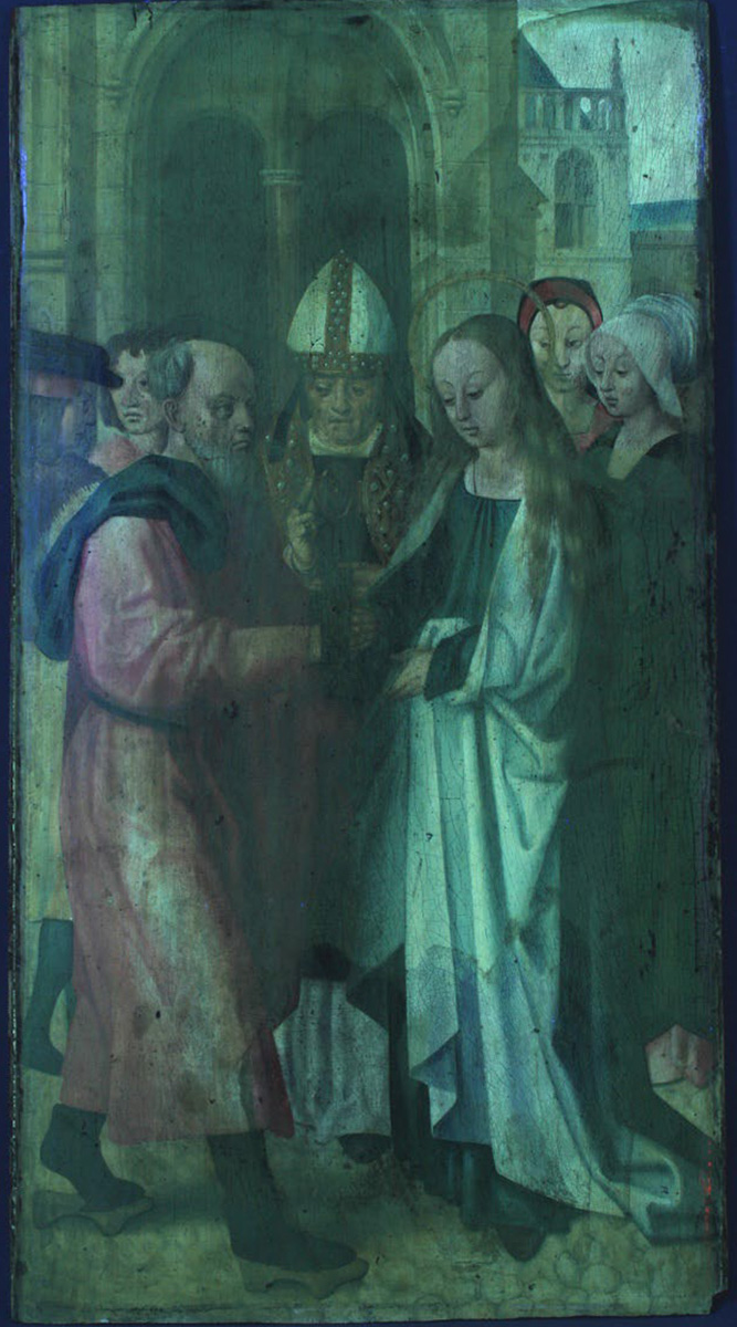 W przeszłości zmieniono format obrazu, obcinając kilka centymetrów z góry i dołu deski (na krawędziach widoczne są drobne wykruszenia warstwy malarskiej wraz z zaprawą, przy górnej krawędzi zauważalny jest także ślad narzędzia typu piła lub pilnik). Prawdopodobnie odcięte fragmenty zostały usunięte z powodu gorszego stanu zachowania. Obraz przedstawiający scenę Zaślubin Marii pokryty był grubą warstwą werniksu, który bardzo pożółkł, zniekształcając pierwotną kolorystykę obrazu. W kilku miejscach widoczne były zabrudzenia. Nielicznie występowały ubytki sięgające podłoża. Zostały one w przeszłości zakitowane i dość precyzyjnie wyretuszowane. Miejsca te uległy zmianom barwnym. Uzupełnienia wykonano najprawdopodobniej niezbyt dawno, ponieważ są one widoczne na fotografiach luminescencji wzbudzonej UV jako drobne czarne punkty. Fotografia w UV uwidoczniła również warstwę werniksu, a po kolorze jego luminescencji można domniemywać, że w jego skład wchodzi naturalna żywica (damara lub mastyks).