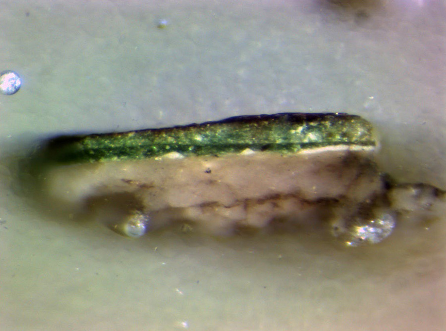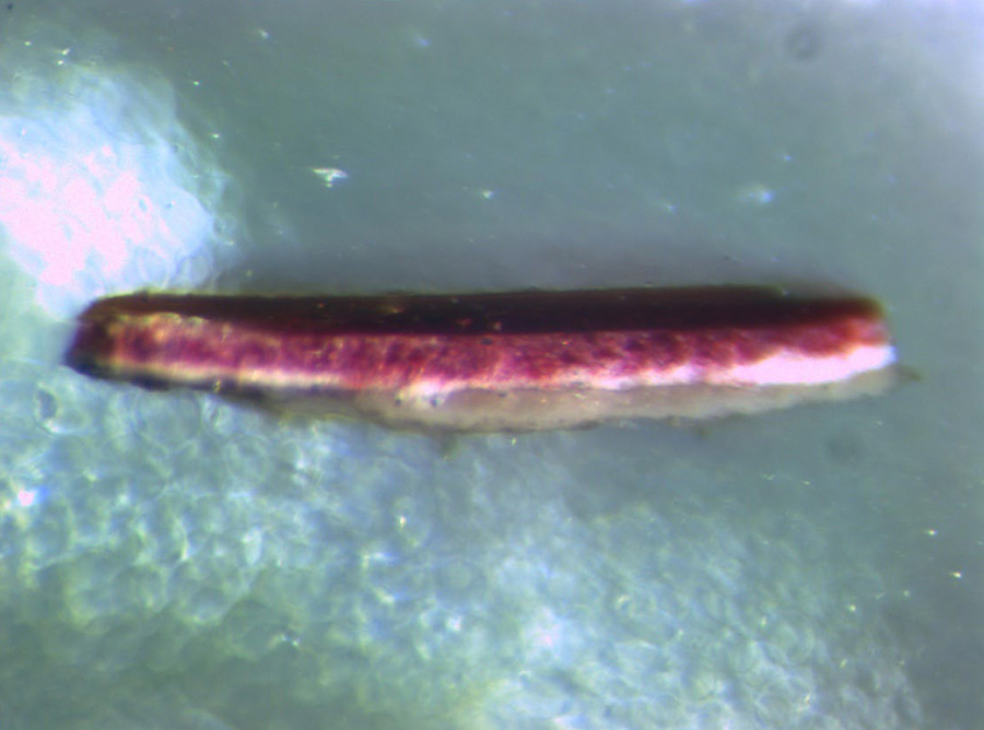 Wykonano przekroje stratygraficzne przez warstwy technologiczne obrazu. Pobrane maleńkie próbki zatopiono w przezroczystej żywicy, a po odpowiednim opracowaniu oglądano pod mikroskopem. Analiza takich próbek pozwala lepiej poznać technologię malarską, a także – przy użyciu zaawansowanych metod fizycznych – zbadać użyte przez twórcę materiały.