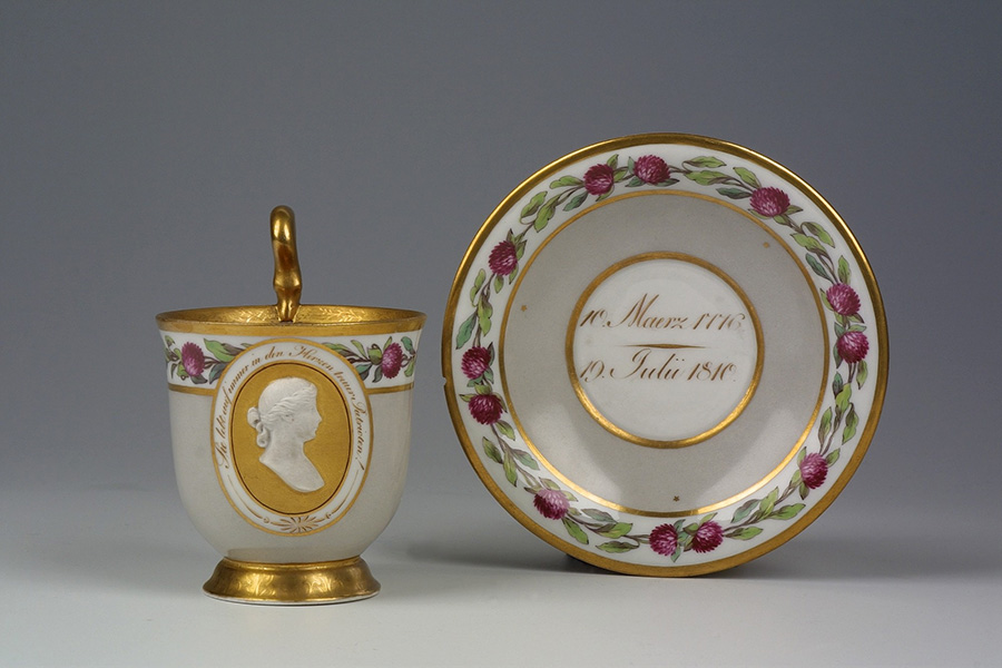 Kunsztowny zestaw z naszej kolekcji tworzą dzwonowata filiżanka z uchwytem wyniesionym poza krawędź wylewu, zwieńczonym głową węża, oraz okrągły, wgłębiony spodek. Całość jest dekorowana naszkliwnie, malowana i złocona. Filiżanka w części frontalnej zawiera biskwitowe profilowe popiersie królowej na tle medalionu, wokół którego umieszczono wspomnieniowy napis: „Sie lebt auf immer in den Herzen treuer Patrioten!”. Krawędź wylewu zdobi fryz nieśmiertelników w kolorze manganowego różu. Spodek jest dekorowany analogicznie, w jego lustrze umieszczono dzienne daty urodzin i śmierci królowej. Zarówno kształt naczyń, jak i wyważona kolorystyka zestawu łącząca surowość szarych malatur z licznymi złoceniami i purpurą wpisują się w estetykę biedermeieru. Inspirowanie się formą antycznych naczyń, upraszczanie wzorców zaczerpniętych ze stylu empire oraz powściągliwość w stosowaniu dekoracji to tylko niektóre cechy tej ostatniej fazy klasycyzmu. Również idea kompozycyjna profilowego popiersia królowej posiada swój rodowód w starożytności, bo czerpie inspirację z bogatej ikonografii przedstawiania władców. Autorem wzorów biskwitowych wizerunków królowej Luizy stworzonych na potrzeby produkcyjne Królewskiej Manufaktury Porcelany w Berlinie był tamtejszy profesor modelowania Leonhard Posch. Jego działalność nie ograniczała się jedynie do pracy na rzecz berlińskiej manufaktury, był także uznanym rzeźbiarzem i medalierem zatrudnionym w Mennicy Królewskiej oraz w Królewskiej Odlewni Żeliwa.