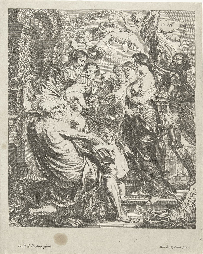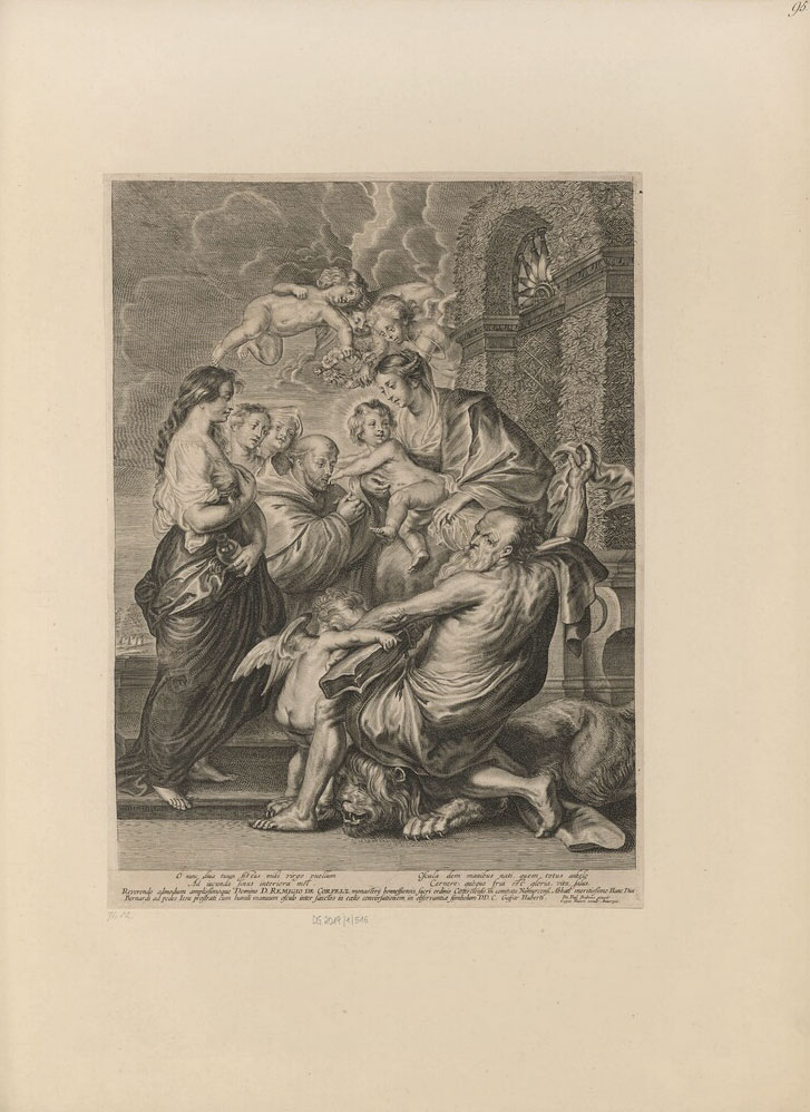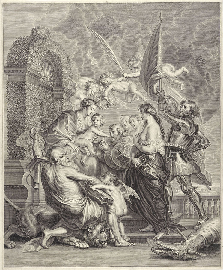 Wykonał ją Remoldus Eynhoudts (1613–ok. 1680), czynny w Antwerpii malarz i akwaforcista, który tajniki artystycznego warsztatu zgłębiał pod okiem Adama van Noorta (1562–1641). Sygnatura artysty „Remoldus Eynhouedt feci[t.]” widoczna jest w prawym dolnym rogu grafiki. Po przeciwnej stronie drugi odautorski napis wskazuje na autora malarskiego wzorca przedstawienia: „Pet. Paul. Rubbens pinxit.” Rycina powtarza bowiem kompozycję wspaniałego obrazu zatytułowanego Madonna z Dzieciątkiem i świętymi, który Peter Paul Rubens (1577–1640) namalował krótko przed śmiercią ok. 1636–1640 roku.