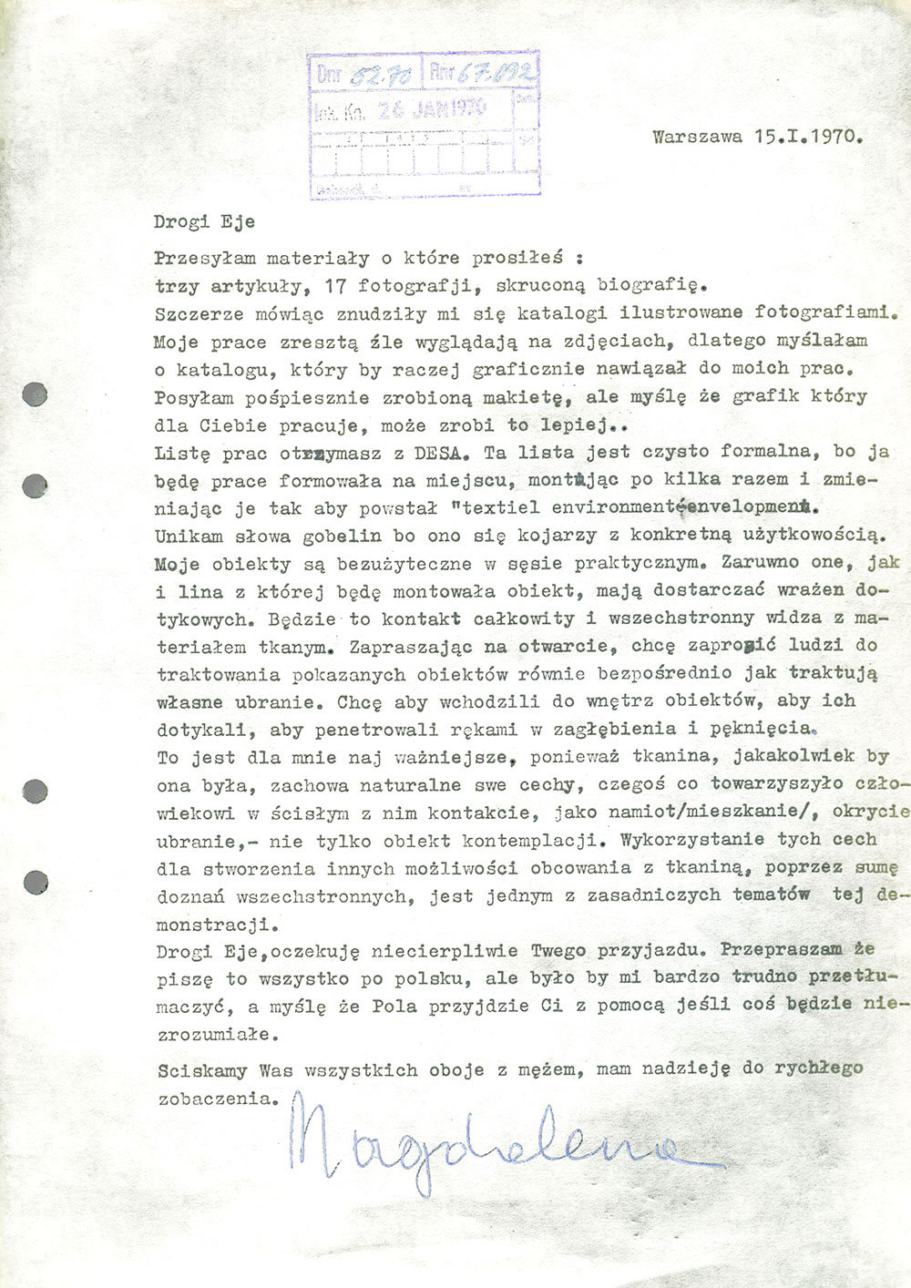 Jak pisała sama Abakanowicz w jednym z listów adresowanych do Södertälje Konsthall tuż przed swoją indywidualną wystawą w 1970 r.: „Chcę zaprosić ludzi do traktowania tych obiektów równie bezpośrednio jak traktują własne ubranie. Chcę, aby wchodzili do wnętrz obiektów, aby ich dotykali, aby penetrowali rękami w zagłębienia i pęknięcia”.