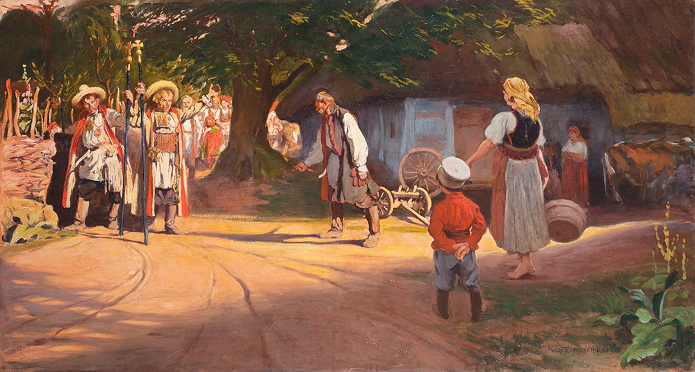 W zbiorach Muzeum Narodowego we Wrocławiu znajduje się kilka prac Włodzimierza Tetmajera, z których moją szczególną uwagę zwrócił malowany na płótnie obraz Przed Piastową chałupą, znany również jako Piast i Rzepicha lub Piastowi goście. Akcja rozgrywa się latem, o czym świadczą kwitnące malwy i dziewanna. W pełnym słońcu zmierza drogą ku chałupie orszak postaci wiedzionych przez dwójkę nietypowych pielgrzymów. Na powitanie wychodzi im Piast, dalej za nim ku gościom zwraca się Rzepicha, a towarzyszy jej odwrócony tyłem do widza synek. Obok widzimy fragmenty zabudowań wiejskich, drewnianą koleśnicę i koło od wozu – elementy nawiązujące do zajęć pierwszego Piasta, który według Galla Anonima był oraczem, a wedle późniejszych podań m.in. kołodziejem. Szczególnie godne uwagi jest umieszczenie przez Tetmajera motywu legendy o protoplaście piastowskiego rodu w realiach Bronowic – widzimy tu nie tylko typową podkrakowską zabudowę, ale również charakterystyczne bronowickie stroje.
