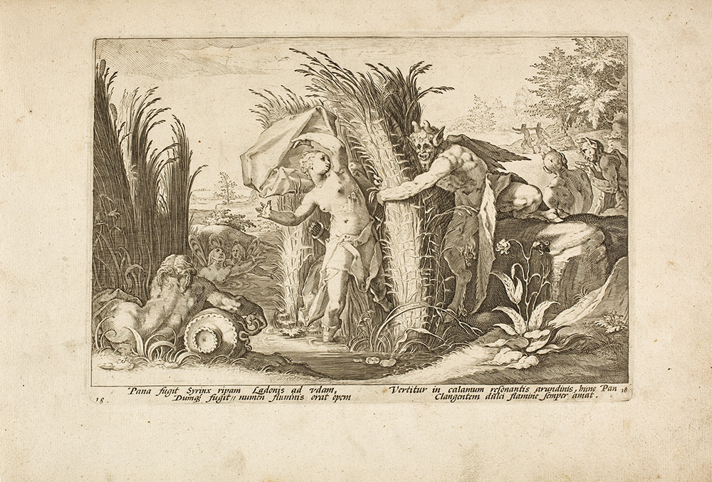 Miedzioryt zatytułowany Pan porywający nimfę Syrinks stanowi osiemnastą z pięćdziesięciu dwóch ilustracji do słynnego dzieła Owidiusza, w którym rzymski poeta, bogato czerpiąc z mitologii greckiej i rzymskiej, opowiedział historię stworzenia świata, posługując się tytułowym motywem Przemiany. Po raz pierwszy praca ta wydana została w kierowanym przez niderlandzkiego grafika, malarza i wydawcy warsztacie w Haarlemie w 1589 roku.
