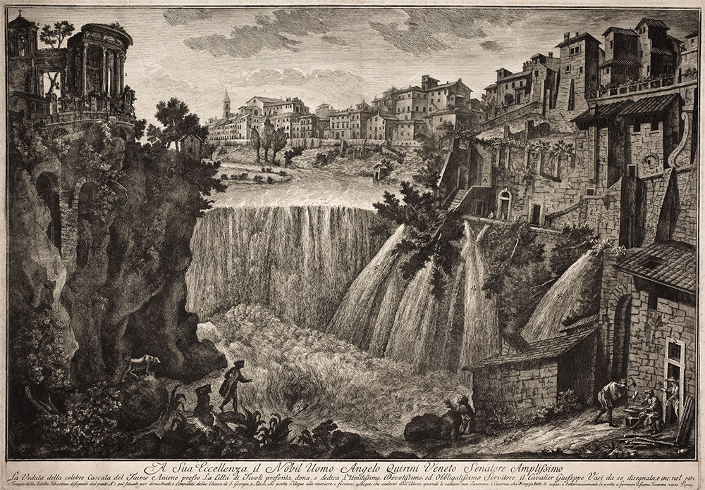 Jednym z miejsc niezwykle ważnych w takiej podróży było Tivoli, niewielkie miasteczko malowniczo położone na zboczach Wzgórz Tyburtyńskich, na wschód od Rzymu, z reliktami rzymskiej osady Tibur. Zabudowania miasteczka wznoszące się ponad wodospadem na rzece Aniene oraz ruiny antycznej świątyni Westy na szczycie urwiska, to widok utrwalony przez Giuseppe Vasiego i jest on doprawdy niesamowity!