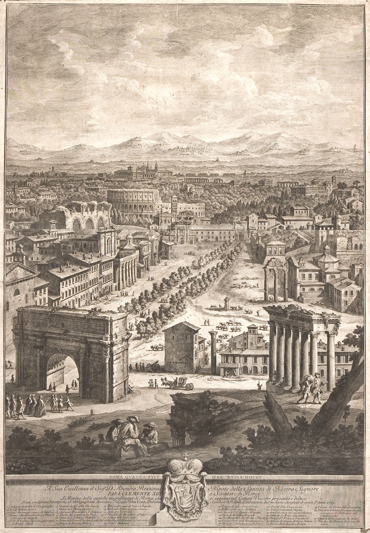Przypominam sobie sentencję umieszczoną na jednej z włoskich grafik ze zbiorów naszego muzeum: Roma quanta fuit ipsa ruina docet („Same ruiny wskazują na to, jak wielki był Rzym”). Mam na myśli monumentalną (ponad metr wysokości!) akwafortę Giuseppe Vasiego z 1765 r. przedstawiającą Forum Romanum. Artysta poprowadził ten rozległy widok ze wzgórza bazyliki pod wezwaniem Matki Boskiej Niebiańskiego Ołtarza (Santa Maria in Aracoeli) na Kapitolu przez liczne zabytki starożytnego forum – łuk triumfalny Septymiusza Sewera i świątynię Saturna na pierwszym planie, a także kolumnę Fokasa, świątynię Antonina i Faustyny oraz Koloseum – aż po Lateran z jego kościołami – Świętego Jana (San Giovanni in Laterano), Czterech Męczenników (Santi Quattro Coronati) czy Krzyża Świętego z Jerozolimy (Santa Croce in Gerusalemme).