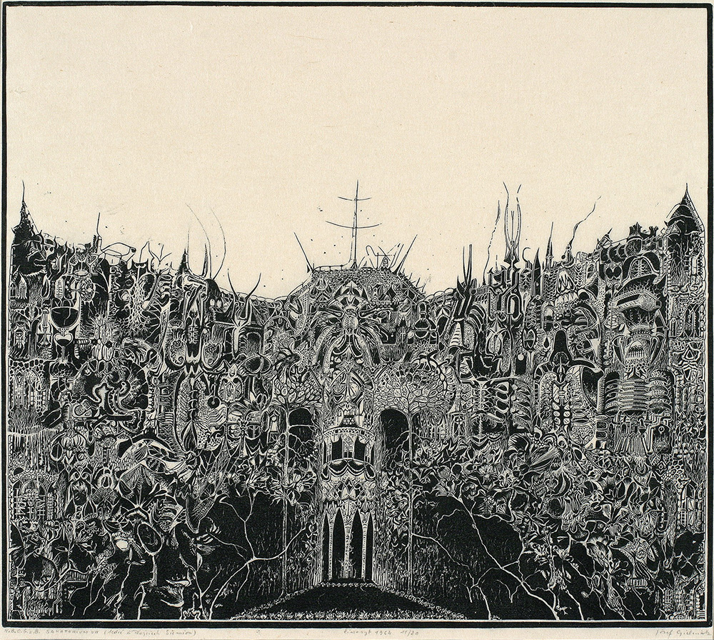 Abstrakcyjne i surrealistyczne sceny, niezliczona liczba szczegółów i fascynacja pomieszana z przerażeniem. Pierwsze, co przychodzi do głowy, to malarstwo Zdzisława Beksińskiego. Jednak z jego czasów można się cofnąć dwadzieścia lat wstecz i przenieść do zupełnie innej techniki. Chodzi tu o linoryt Józefa Gielniaka, a dokładniej jego pracę z 1964 roku zatytułowaną N.B.O.G z B. – Sanatorium VII.