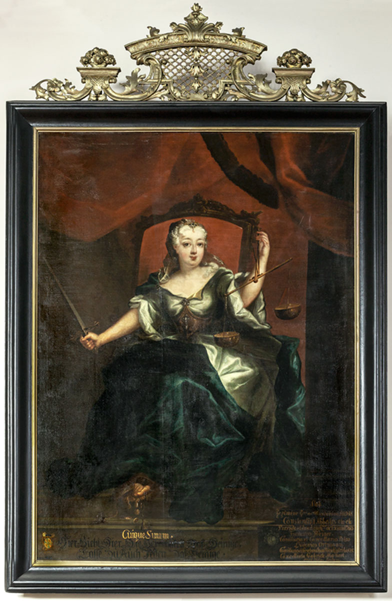 Zwrócono także już wcześniej uwagę na fakt, iż fizjonomia personifikacji Sprawiedliwości przypomina wygląd cesarzowej Elżbiety Krystyny z domu Welf (1691–1750), żony Karola VI von Habsburg. Zwłaszcza znana z rozmaitych portretów fryzura cesarzowej miała zdradzać to podobieństwo. A jej kryptoportret w przedstawieniu Iustitii to jakoby świadome podkreślenie faktu, iż Elżbieta Krystyna była uosobieniem prawa i sprawiedliwości, którymi chroniła swój lud przed nieprawością. [Zob. B. Lejman, op. cit., s. 77–78]