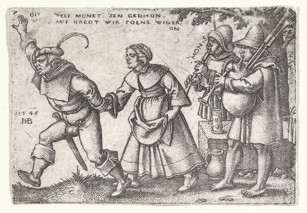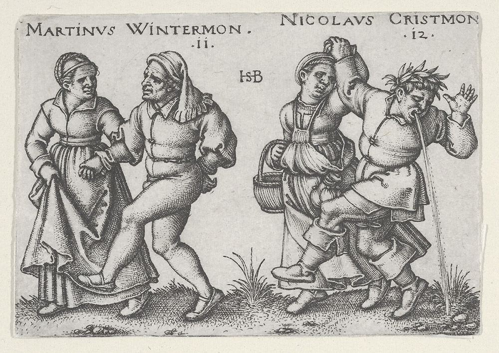 Dwa pierwsze cykle Behama o tej tematyce: Wesele chłopskie (1537) i Pochód weselny (1538–1540), to zespoły odrębnych miedziorytów z przedstawieniami muzykantów, par w tanecznych figurach oraz rodzajowych scenek o biesiadno-zabawowym kontekście. Trzeci, ostatni z serii: Wesele chłopskie, zwany także Dwanaście miesięcy (1546–1547), składa się z dziesięciu grafik, nieco większych od poprzednich, bowiem na siedmiu przedstawiono po dwie pary, a na trzech wieloosobowe sceny. Novum jest również umieszczenie nad każdą z par imienia i nazwiska tancerza – zestawienia nazwy miesiąca z najpopularniejszym w danym miesiącu świętym.