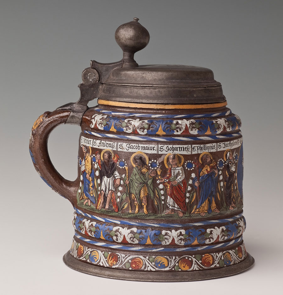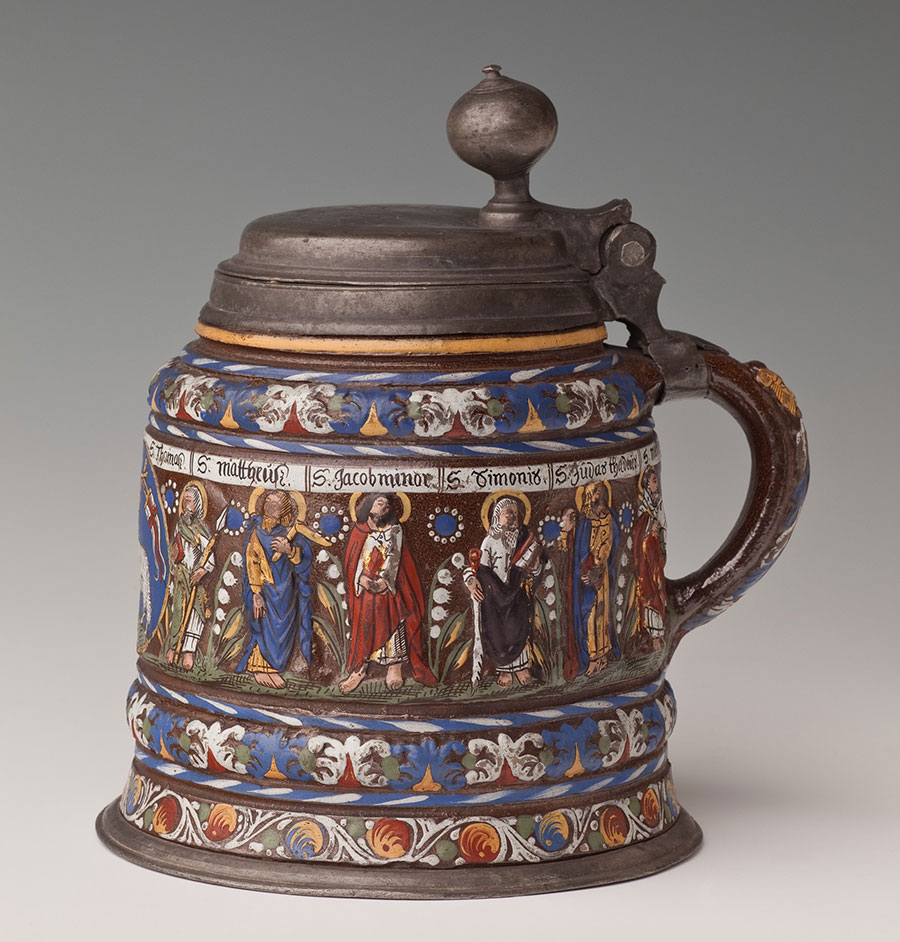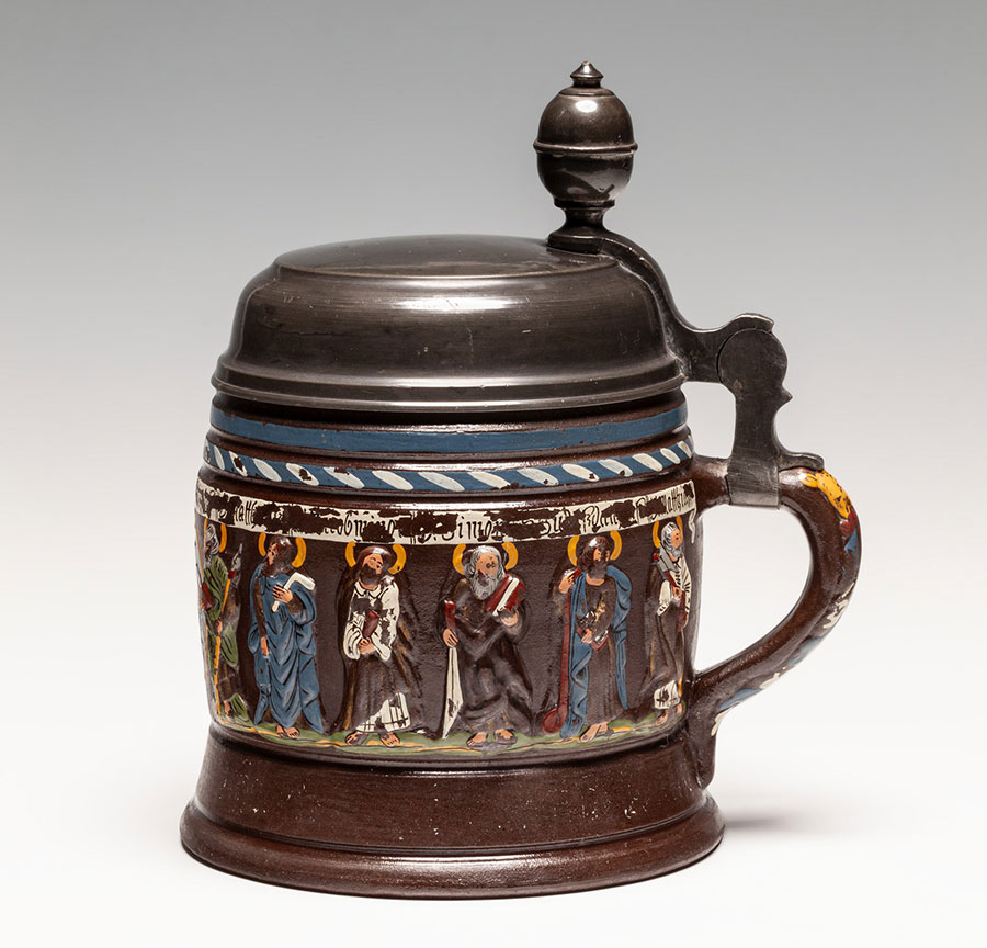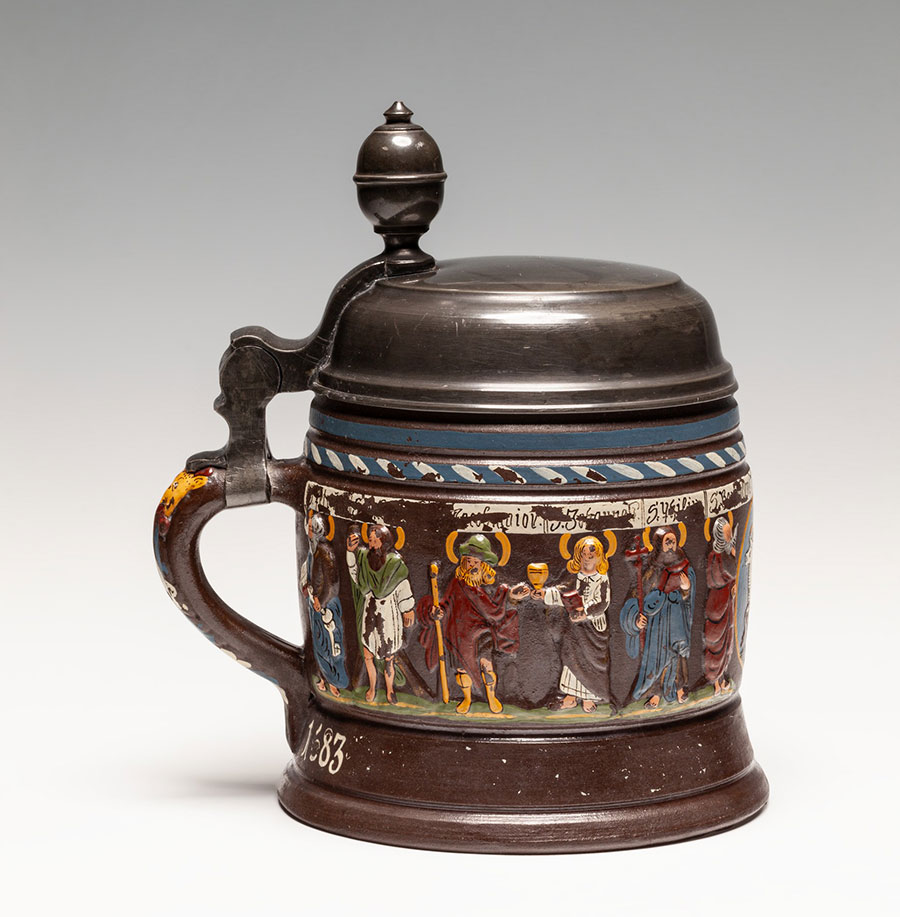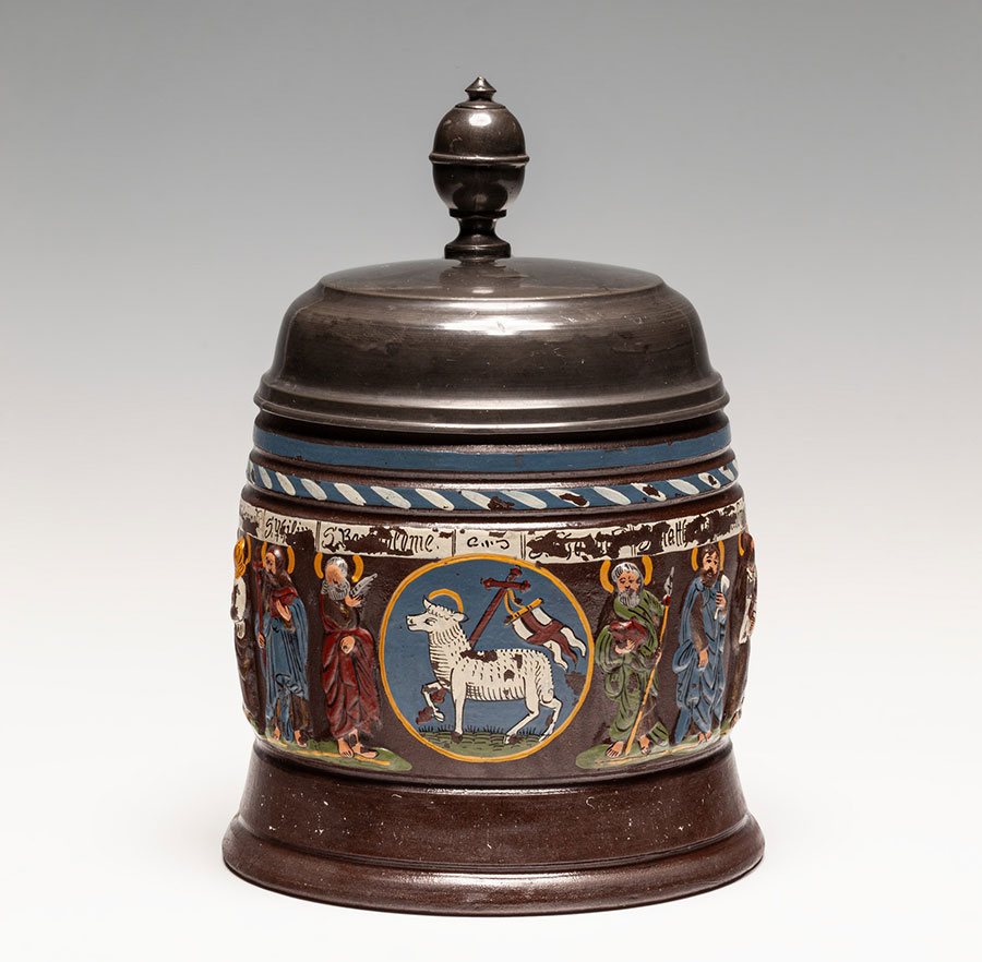 Po pierwszym przelotnym spojrzeniu na naczynie chce się z pewnym lekceważeniem powiedzieć: typowy kufel „apostolski”, jeden z wielu wykonanych na przełomie XVII i XVIII stulecia w Creussen. W tym bawarskim mieście udokumentowany wyrób kamionkowych naczyń to początek XVII w. Z pierwszych lat zachowały się kufle i butle o pięknym ciemnobrązowym kolorze zdobione precyzyjnymi nakładkami. Przeważały motywy figuralne (sylwetki apostołów i świętych, personifikacje planet i cnót) uzupełnione ornamentem, czasami inskrypcją.