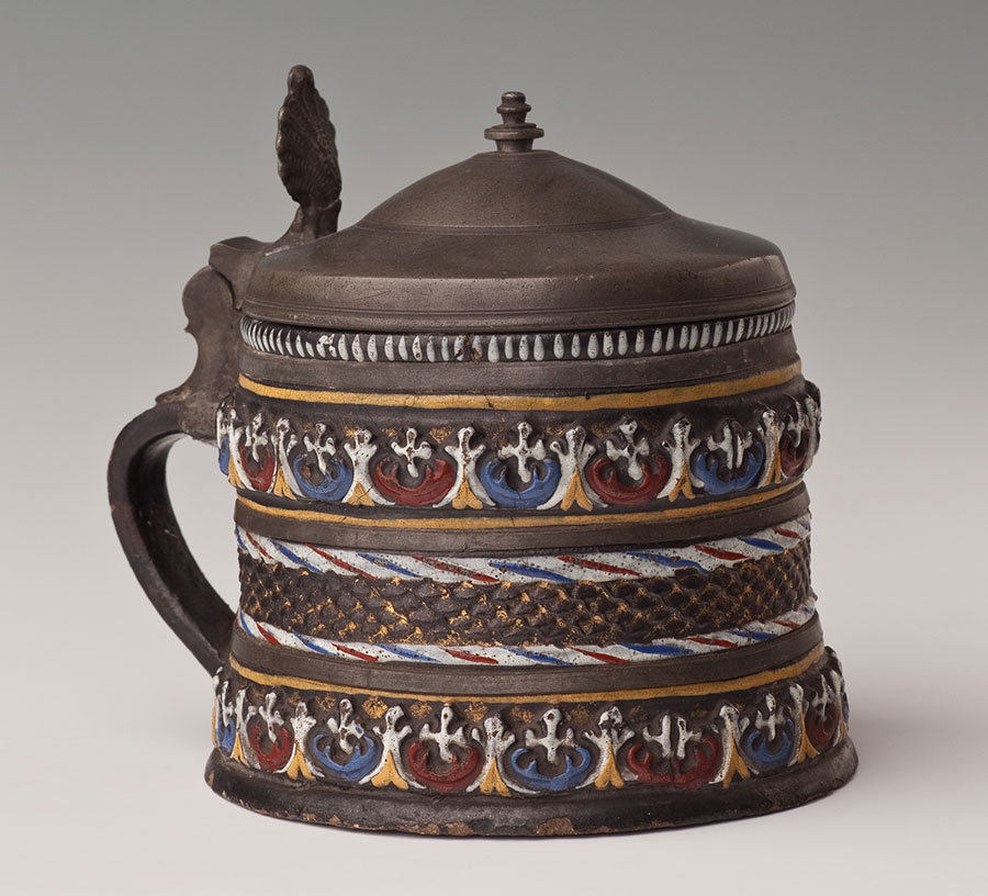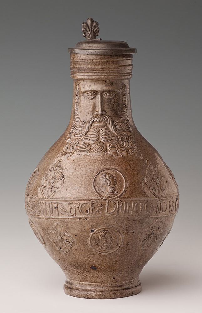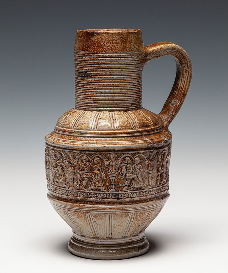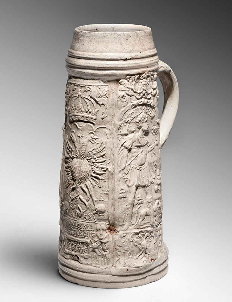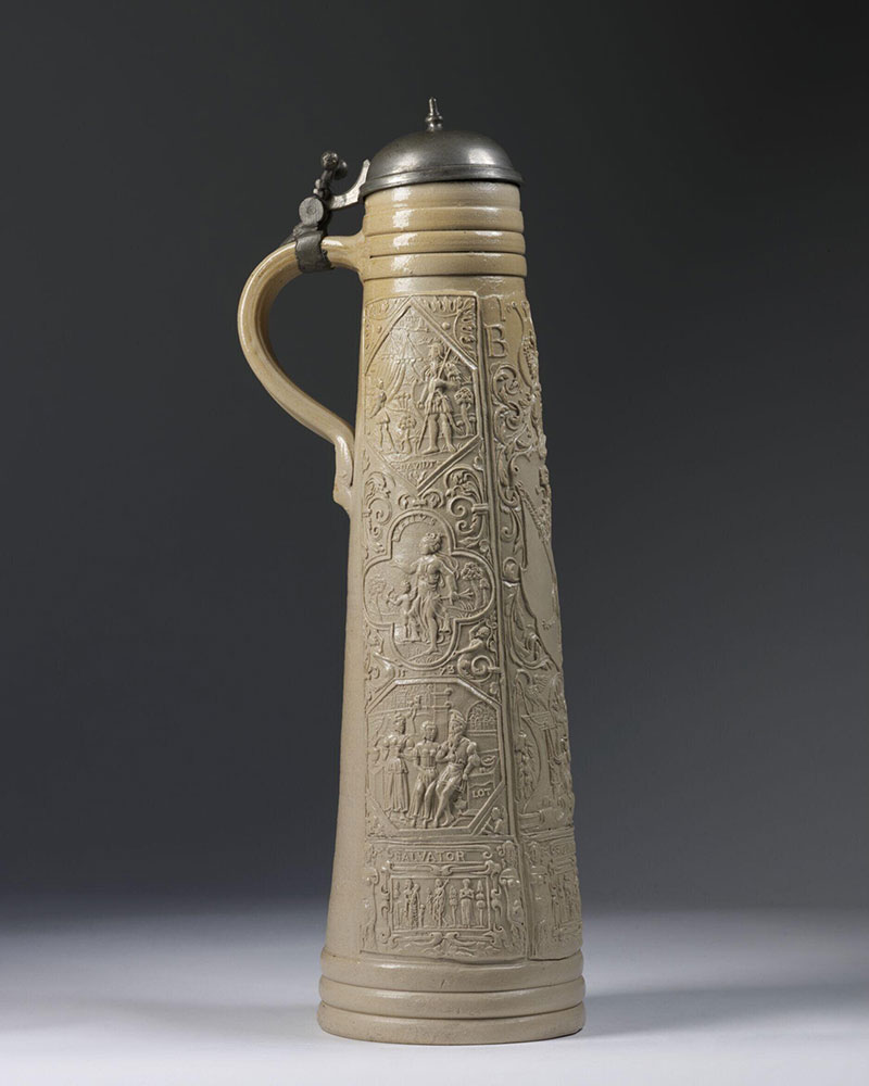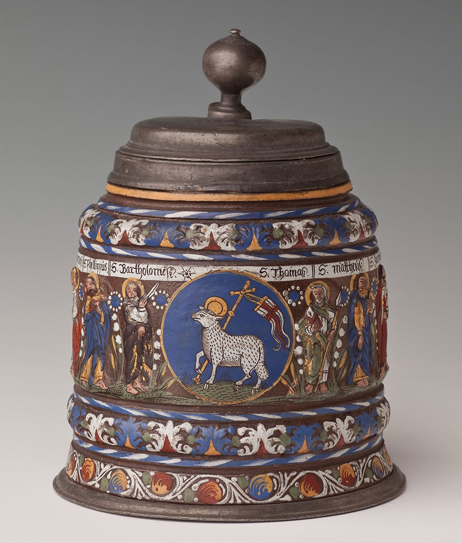 Po pierwszym przelotnym spojrzeniu na naczynie chce się z pewnym lekceważeniem powiedzieć: typowy kufel „apostolski”, jeden z wielu wykonanych na przełomie XVII i XVIII stulecia w Creussen. W tym bawarskim mieście udokumentowany wyrób kamionkowych naczyń to początek XVII w. Z pierwszych lat zachowały się kufle i butle o pięknym ciemnobrązowym kolorze zdobione precyzyjnymi nakładkami. Przeważały motywy figuralne (sylwetki apostołów i świętych, personifikacje planet i cnót) uzupełnione ornamentem, czasami inskrypcją.