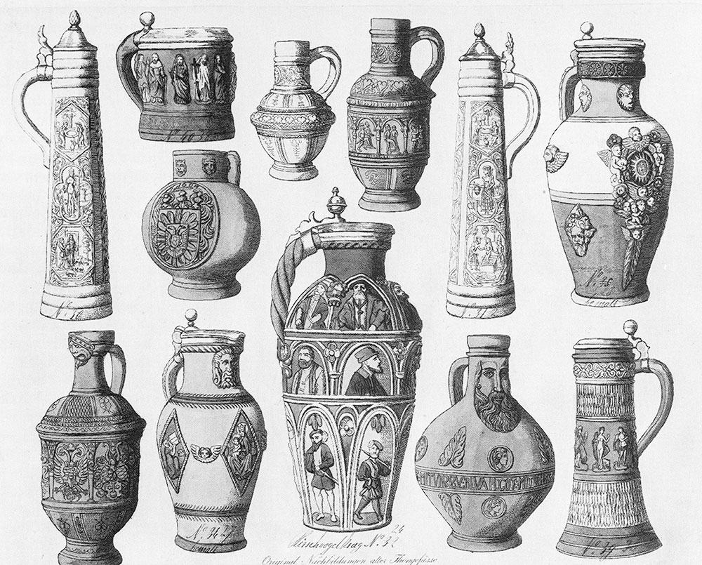W ceramice najwcześniej zaczęto „multiplikować” kamionkowe naczynia pochodzące z warsztatów nadreńskich. Początkowo z Siegburga – okazałe snelle (wysmukłe dzbany o cylindrycznym, lekko zwężonym ku górze korpusie), mniejsze od nich pinty, lejkowe kubki. Nieco później stały się popularne naśladownictwa dzbanów kolońskich dekorowanych charakterystycznymi nakładkami z wizerunkiem brodacza oraz wykonanych w Raeren, których brzuśce ujmował fryz przedstawiający tańczących włościan. W latach sześćdziesiątych nastała moda na siedemnastowieczne wyroby bawarskie i turyngeńskie – powielano brązowe kufle i dzbany z dekoracją malowaną barwnymi emaliami.
