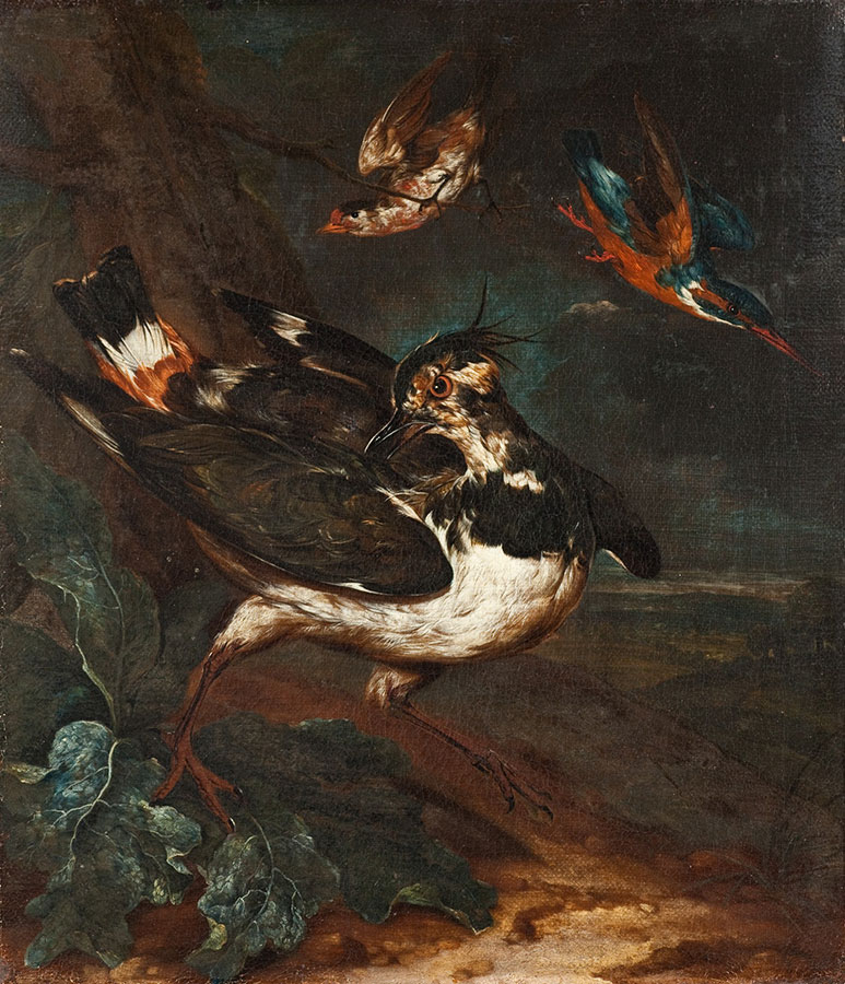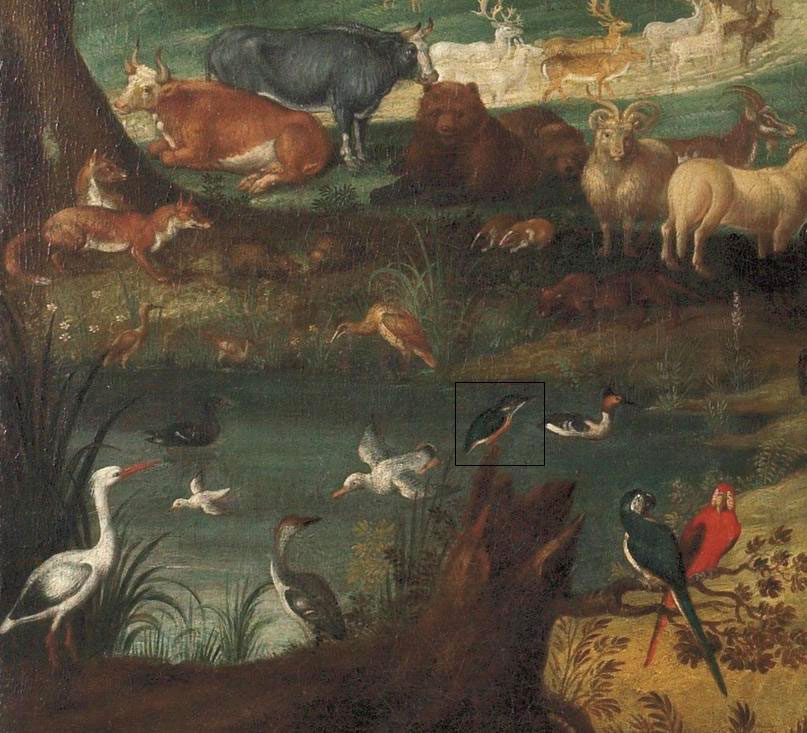 Na obrazie namalowanym ok. 1700 roku de Hamilton ukazał na pierwszym planie w dynamicznej pozie czajkę (ptaka znacznie większego od naszego bohatera). Nad jej głową widoczny jest siedzący na cienkiej gałązce szczygieł – kolorowy ptak wielkości zbliżonej do wróbla. W górnym prawym rogu obrazu przedstawiony został z kolei w locie zimorodek. Doskonale widoczna jest spodnia strona jego skrzydeł pokrytych pomarańczowej barwy piórami, tak zresztą jak brzuch tego ptaka. Malarz tak sugestywnie przedstawił ruch zimorodka, że wydaje się nam, iż zaraz ptak ten wyfrunie z wnętrza obrazu! Gdzież jednak mógłby znaleźć pożywienie w salach galerii? Musiałby chyba niezwłocznie wlecieć do któregoś z obrazów przedstawiających ryby. A takie dzieła również znajdują się na wystawie sztuki europejskiej.