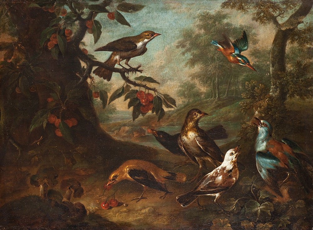 Zimorodki odnajdziemy jeszcze na dwóch innych obrazach ze zbiorów Muzeum Narodowego, nieeksponowanych jednak stale w galerii. Pierwszym z nich są Ptaki w pejzażu, namalowane ok. 1750 roku na płótnie o wymiarach 70 × 95 cm przez wiedeńskiego malarza Franza Antona Grafensteina (1717 – ok. 1780). To kolejny znakomity animalista, którego dzieła zachowały się m.in. w opactwie benedyktyńskim w Melku nad Dunajem, Monachium czy Sybinie w Siedmiogrodzie. Na tym obrazie widzimy aż sześć gatunków ptaków: parę wilg (żółto-czarny samiec zjada właśnie owoc czereśni), kosa, drozda śpiewaka, kwiczoła, barwną kraskę (z prawej strony na dole) oraz naszego małego turkusowego nurka przestworzy i toni. Zimorodek ukazany został podobnie jak na poprzednio przywołanym płótnie w locie i to dokładnie w takim samym układzie. Na przelatującego szybko niebieskiego szybowca zdaje się nerwowo reagować kraska. Ten wymierający już niestety w naszym kraju ptak, wraz z zimorodkiem i zwinną żołną, jest najbarwniejszym przedstawicielem polskiej awifauny. Przed 270 laty z pewnością był znacznie liczniejszy i częściej spotykany na wielu obszarach Europy.