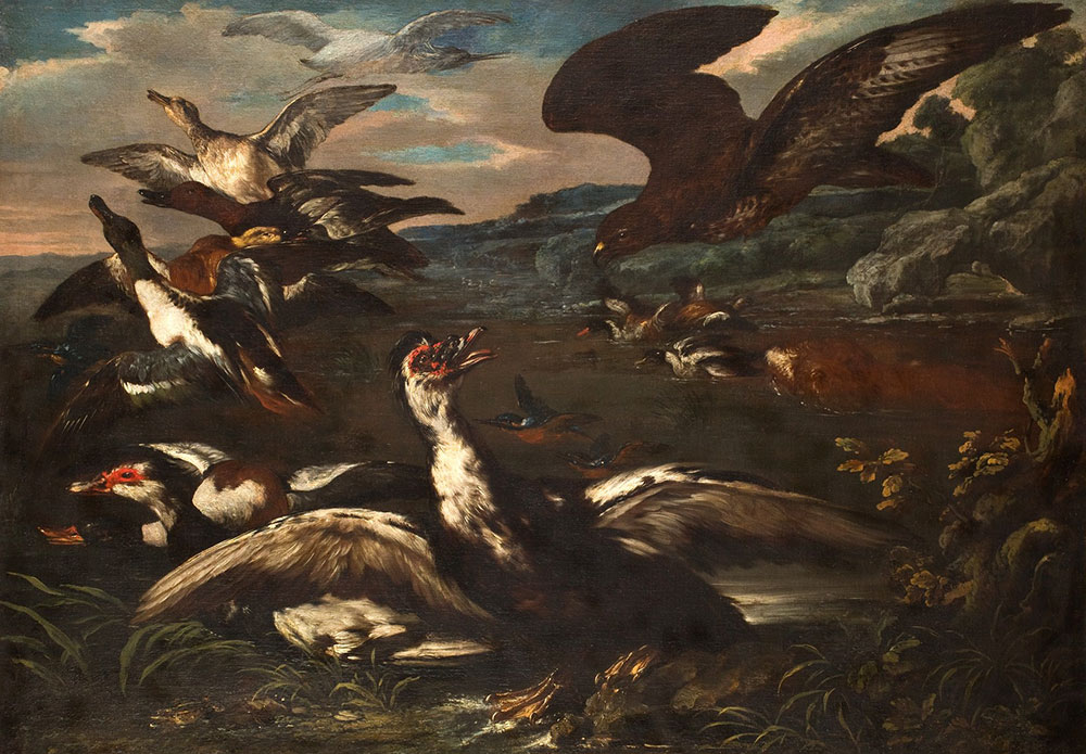 Dzieło przedstawia dramatyczną scenę ataku myszołowa (jednak nie jastrzębia, jak określono tego drapieżnika w katalogu malarstwa niderlandzkiego) na stadko kaczek (piżmówek i rożeńców), wśród których w samym centrum obrazu dostrzec możemy przelatującą parę zimorodków. Dynamika kompozycji tego dzieła poprzez wierne oddanie układu i ruchu skrzydeł ptaków przerażonych pojawieniem się drapieżcy, znakomicie potęguje wrażenie dramatyzmu. Zimorodki także uciekają przed myszołowem i prawdopodobnie zdołają się przed nim ukryć. A przynajmniej taką mamy nadzieję!