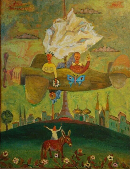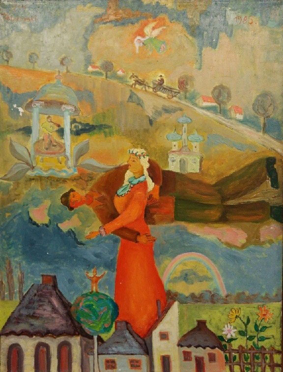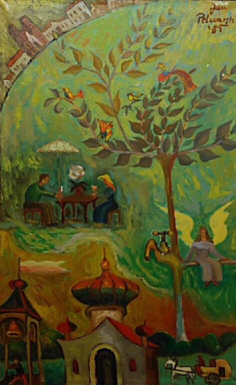 Czym się ze mną/nami dzieli? Opowiada przeróżne historie, niczym sny na jawie. Postacie-bohaterzy scen z nadnaturalnymi mocami. Oto kobieta idzie w życie ze swoim oblubieńcem pod pachą (artystyczny feminizm?, jakie to mądre). Drzewo, które obsiadły jakieś rajskie ptaki ma wmontowany kran, którego pilnuje siedząca obok kobieta-anioł-barmanka(?). Obok biesiaduje para, to musi być drzewo dobrego i lepszego, jak sądzę. Zabudowania, domki, kapliczki rosną przy sobie niczym maślaczki, trzymając się blisko (może słuszna asekuracja biorąc pod uwagę ich konstrukcję architektoniczną, a może przyjaźń). Słowem – sielsko i anielsko.