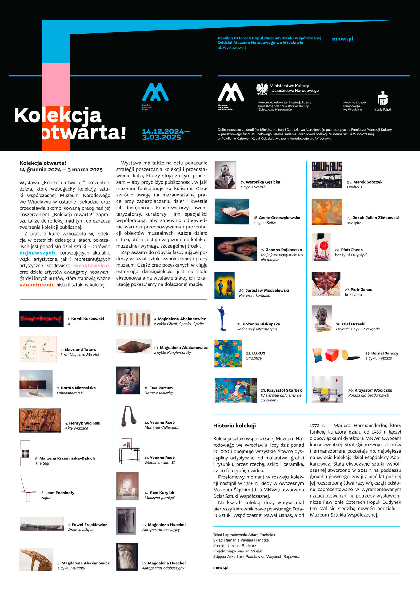 Zwiedzając wystawę czasową „Kolekcja otwarta!” oraz wystawę stałą „Kolekcja sztuki polskiej II poł. XX i XXI wieku”, widzowie mają niezwykłą okazję zobaczenia w sumie ponad 400 prac z kolekcji sztuki współczesnej Muzeum Narodowego we Wrocławiu.