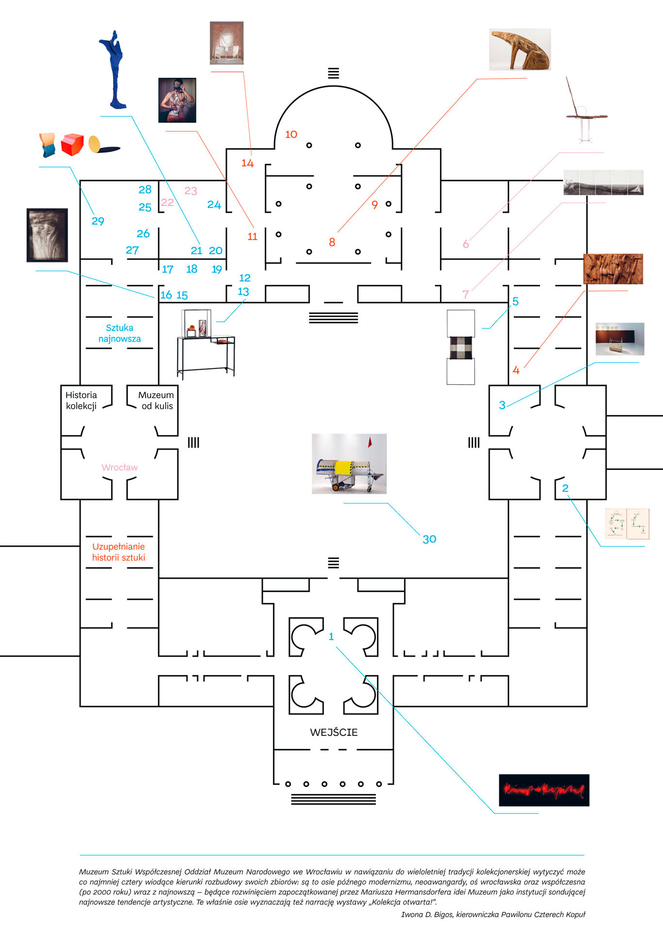„Muzeum Sztuki Współczesnej Oddział Muzeum Narodowego we Wrocławiu w nawiązaniu do wieloletniej tradycji kolekcjonerskiej wytyczyć może co najmniej cztery wiodące kierunki rozbudowy swoich zbiorów: są to osie późnego modernizmu, neoawangardy, wrocławska oraz współczesna (po 2000 roku) i najnowsza – będące rozwinięciem zapoczątkowanej przez Mariusza Hermansdorfera idei Muzeum jako instytucji sondującej najnowsze tendencje artystyczne. Te osie wyznaczają też narrację najnowszej wystawy” – dopowiada Iwona D. Bigos, kierowniczka Pawilonu Czterech Kopuł.