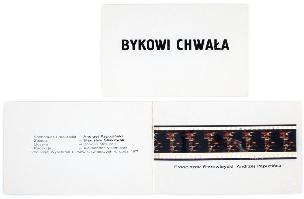 Wśród druków ulotnych przechowywanych w Dziale Sztuki Wydawniczej Muzeum Narodowego we Wrocławiu znajduje się nad wyraz ciekawe zaproszenie na pokaz filmu dokumentalnego „Bykowi chwała”. Od typowych zaproszeń tego rodzaju odróżnia je to, że wklejona została do niego taśma filmowa, a właściwie siedem klatek z rzeczonego filmu, przedstawiających Franciszka Starowieyskiego nad zbieranymi przez siebie antykami. W ten typowy dla siebie „nietypowy” sposób artysta informował o jego premierze.
