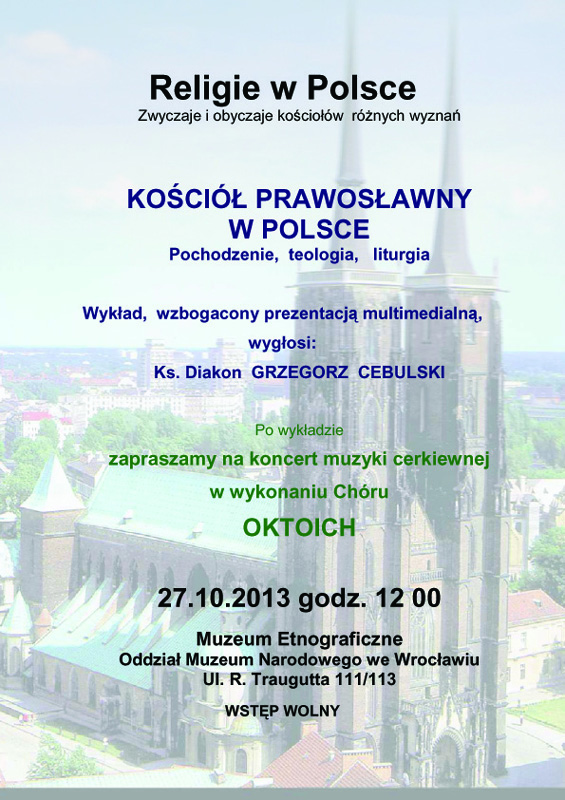 Wykład wzbogacony prezentacją multimedialną wygłosi: Ks. Diakon Grzegorz Cebulski. Po wykładzie zapraszamy na koncert muzyki cerkiewnej w wykonaniu chóru OKTOICH.