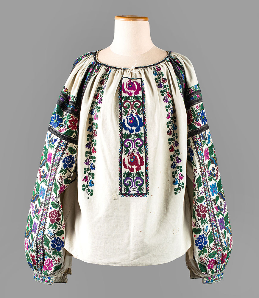 Koszula ma krótki krój i duży, szeroki dekolt, który jest ściągnięty dwoma nitkami przewleczonymi przez wyszyte krzyżyki wykańczające jego brzeg. Rękawy są długie, na dole są mocno marszczone i zakończone wąskim mankietem. Koszula jest ozdobiona haftem krzyżykowym o zgeometryzowanych motywach roślinnych, wykonanym bawełnianymi nićmi w kolorach czarnym, fioletowym, bordowym, zielonym, żółtym i niebieskim.