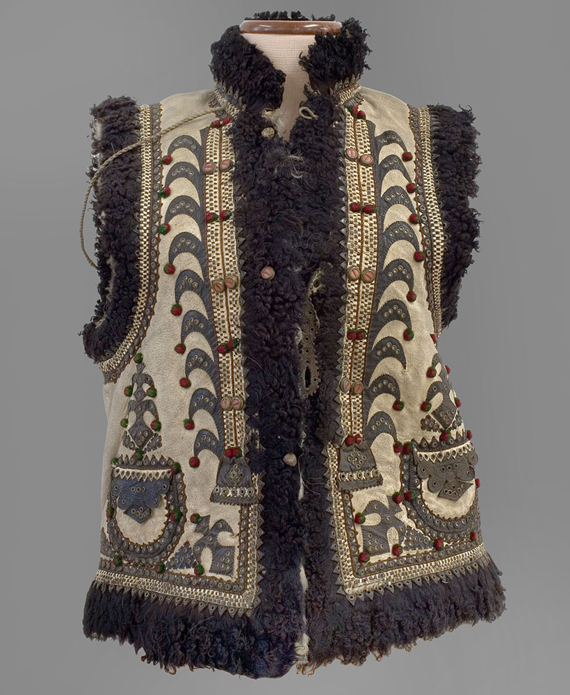 Kożuszek wykonany z jasnej skóry baraniej, obszyty przy wszystkich brzegach pasami z ciemnego futerka. Z przodu znajdują się dwie kieszenie. Krój jest krótki, bez rękawów, uszyty z dużego kawałka skóry, który tworzy dwie części przednie oraz plecy. Na dole pleców umieszczono trzy mniejsze prostokątne wstawki. Pod szyją znajduje się stójka, a z przodu dwa skórzane sznureczki, zakończone wspólnym pomponem ze skórki i włóczki. Kożuszek zapinany jest na dwa skórzane gruzełki i pętelki oraz na jeden metalowy guziczek, a także na skórzany pasek z dziurką, umieszczony na środku. Na dole każdej części przedniej naszyta jest półokrągła kieszonka z patką.