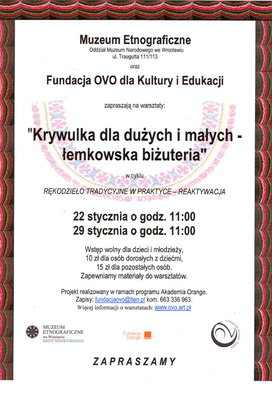 W ramach cyklu – „Rękodzieło tradycyjne w praktyce – reaktywacja zapraszamy o godz. 11 00 na warsztaty . Wstęp wolny dla dzieci i młodzieży; 10 zł dla osób dorosłych z dziećmi; 15 zł dla pozostałych. Projekt realizowany w ramach programu Akademia Orange.