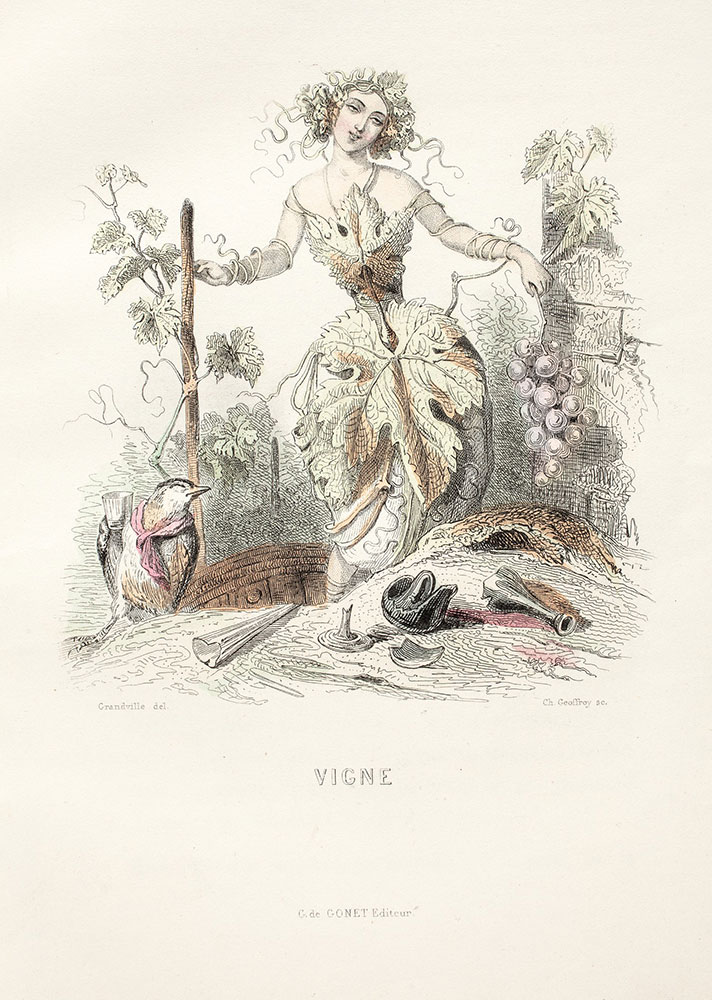 Nie chcąc jednak pozostawać już dłużej w mrocznym klimacie występku i cierpienia, przyjrzyjmy się winorośli – roślinie kojarzonej z Bachusem, bogiem wina. Młoda kobieta z miłym wyrazem twarzy i delikatnym uśmiechem, jedną ręką opiera się o podpórkę, a w drugiej trzyma kiść dorodnych winogron. Przed nią, na ziemi, leżą kawałki rozbitej butli i kieliszka, jednoznacznie wskazując na skutki przedawkowania alkoholu. Obok, w niedbałej pozie, przysiadł ptaszek z kieliszkiem w skrzydełku, z nonszalancko owiniętym wokół szyi delikatnym szalem. Ma zamknięte oczy, główkę zwróconą w kierunku winorośli. Wydaje się trwać w błogim zadowoleniu, podobnie jak zapewne i inne ptaki na co dzień okupujące winnice i urządzające tam ornitologiczne bachanalia, kłopot dla właścicieli, ale i pomoc polegająca choćby na przenoszeniu szlachetnych drożdży winnych z rośliny na roślinę.