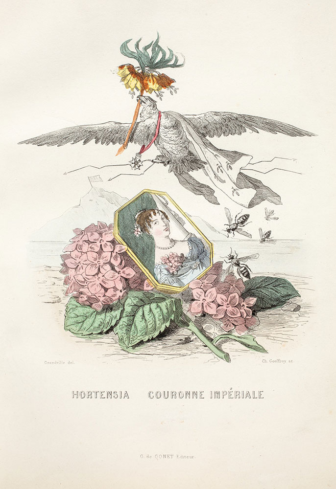 Ptak – orzeł z cesarskiego herbu Bonapartów, trzymający w dziobie szachownicę cesarską, pomoże nam rozwiązać zagadkę tożsamości kobiety, której wizerunek położony jest na gałązce kwitnącej hortensji. Obrazowe wskazówki prowadzą nas do pięknej Hortensji de Beauharnais, urodzonej 10 kwietnia 1783 w Paryżu. Była córką Józefiny, później cesarzowej francuskiej, i wicehrabiego Aleksandra de Beauharnais.
