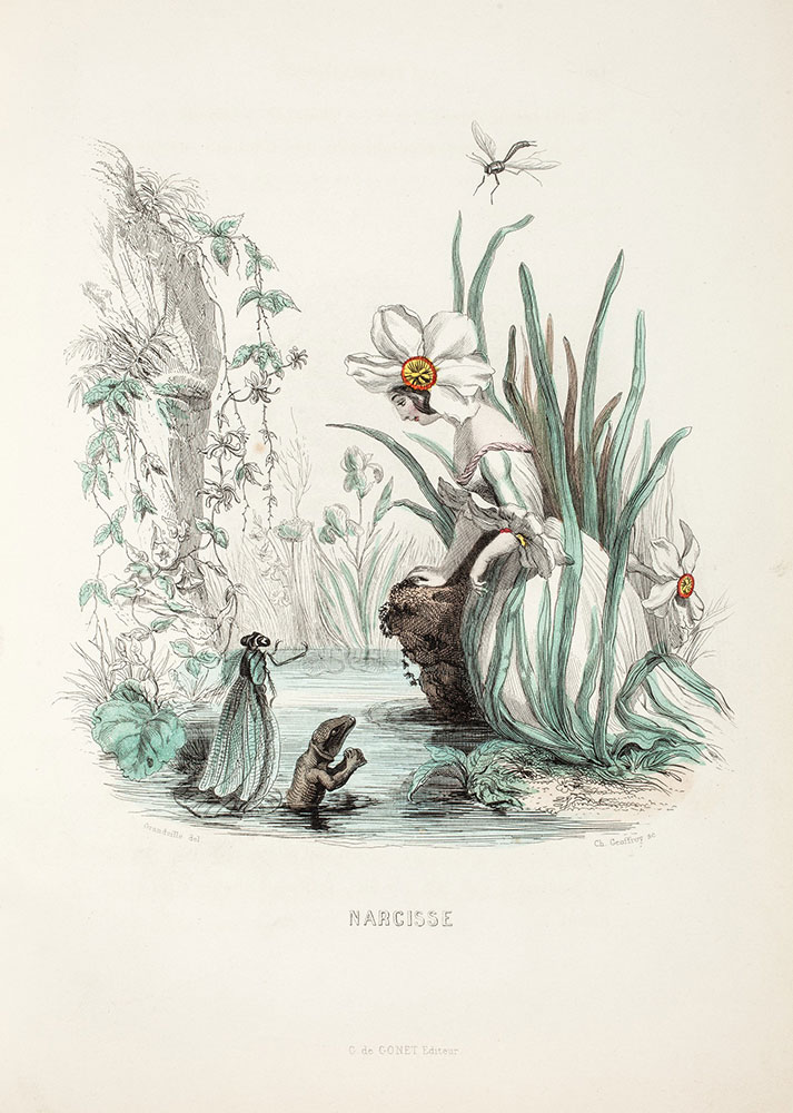 Scena przypomina mit o Narcyzie. Za jego najbardziej znaną wersję uznaje się zawartą w trzeciej księdze Przemian Owidiusza, w której mowa o nieszczęśliwej miłości nimfy górskiej Echo do Narcyza. Odrzucona przez pięknego młodzieńca, nikła z bólu i tęsknoty, aż zostało z niej tylko echo. Pomściła ją Nemezis – bogini zemsty, sprawiając, że Narcyz zakochał się w swoim odbiciu w wodzie, nie mogąc doczekać się wzajemności, pałał namiętnością, i spalił się, zmieniając w złoto i biały kwiat. Wcześniejsza odmiana mitu o Narcyzie, przypisywana Partheniosowi z Nicei, greckiemu poecie z 1 w. p.n.e., kończy się śmiercią samobójczą Narcyza. Możemy jeszcze przywołać współczesną owidiuszowej, spisaną przez gramatyka i mitografa Konona (63 r. p.n.e. – 14 r. n.e.), gdzie nieszczęśliwie zakochanym jest młodzieniec Amejnias, czy poznaną przez Pauzaniasza (ur. między 100 a 110 n.e., zm. po 180 n.e.), greckiego geografa, według której Narcyz zakochuje się w swojej siostrze bliźniaczce. Choć wersje różnią się nieco od siebie, to wszystkie kończy przemiana martwego ciała w kwiat. Motyw opowieści o ukaranej nieczułości odnajdziemy zarówno na planszy ilustrującej kobietę-narcyza jak i w rozdziale poświęconym tej roślinie.