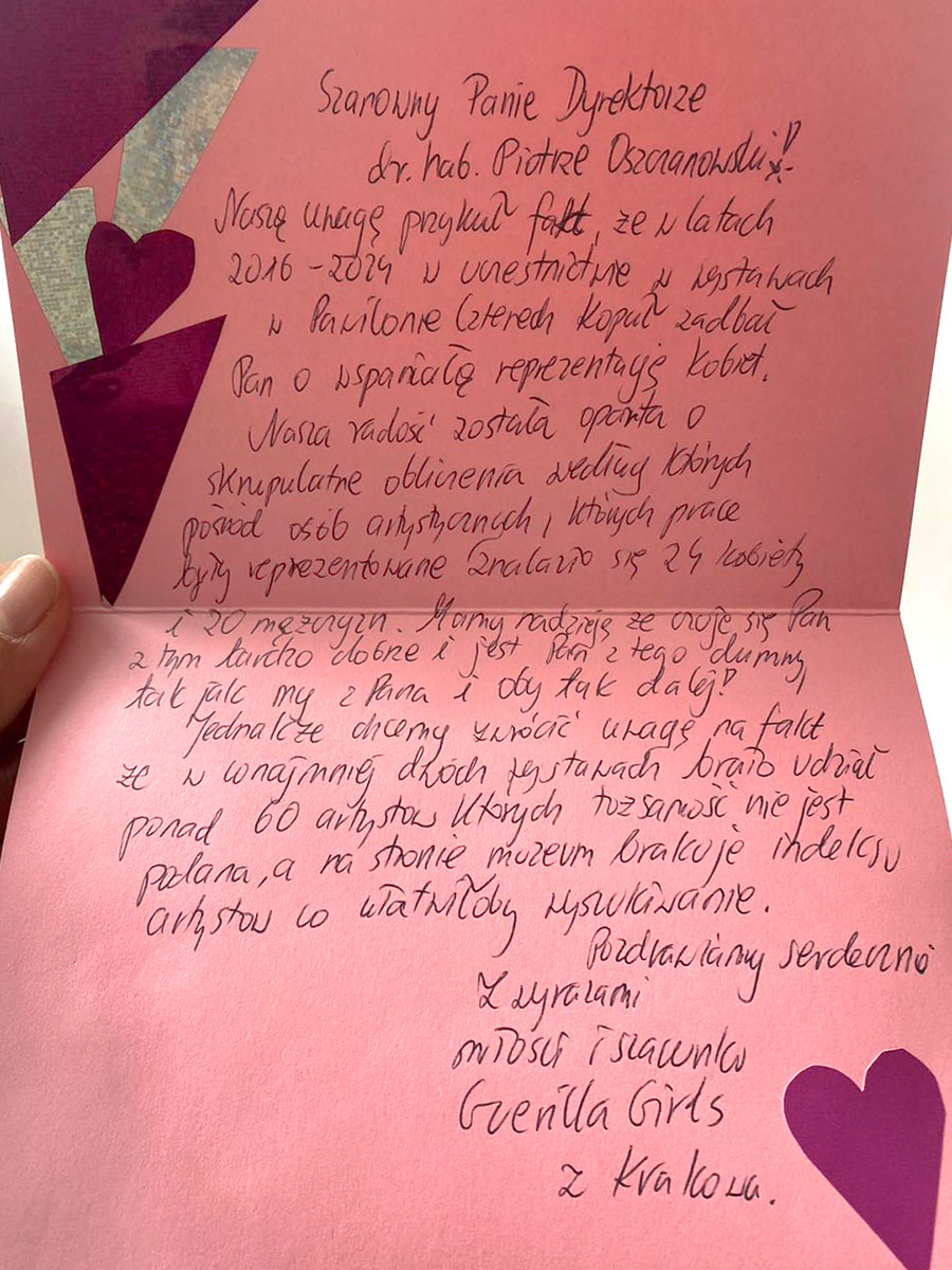 W liście adresowanym do dyrektora Muzeum Narodowego we Wrocławiu Piotra Oszczanowskiego dziewczyny z Krakowa podkreśliły i doceniły starania w dbaniu o wspaniałą reprezentację kobiet na wystawach w Pawilonie Czterech Kopuł Muzeum Sztuki Współczesnej.