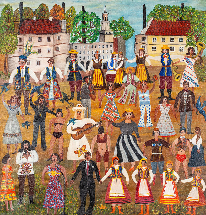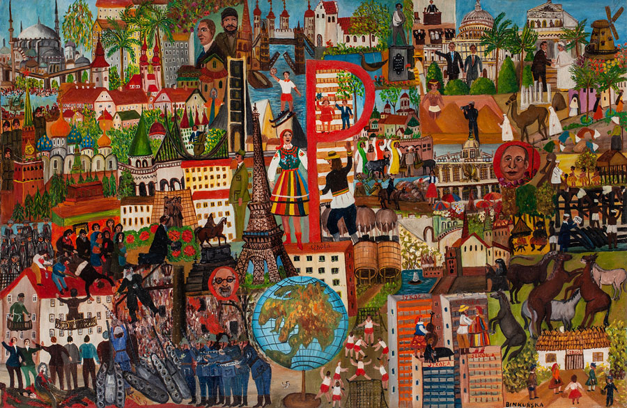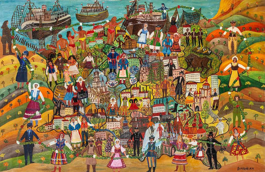 Anna Binkuńska (1908–1997) to artystka, która wypracowała sobie swój własny, szczególny sposób narracji. Jej obrazy, przypominające niekiedy dziecięce mapy obrazkowe, opowiadają o świecie w sposób barwny i wciągający.
