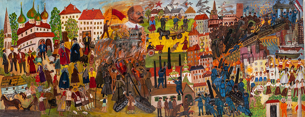 „Ten obraz namalowałam na 25-lecie PRL. Tak mi coś przyszło do głowy. Są tu symbole z każdego państwa, z którym zawarliśmy jakieś umowy czy układy. Czasem symbolem jest ubiór ludowy, czasem znana postać. Np. z Chile – poeta, w Egipcie – nagrywają film, z NRD – namalowałam ich przywódcę Brandta, który klęczy przed pomnikiem getta”.