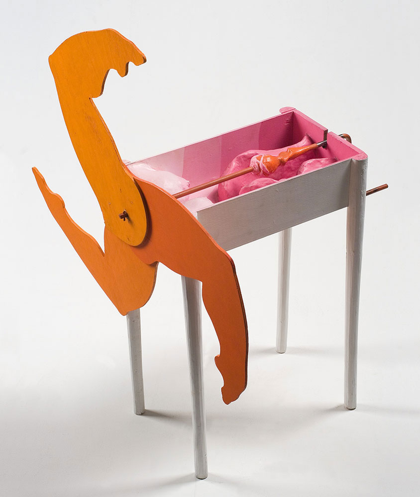 Należy do cyklu „Psychomebelków”, które artystka Maria Pinińska-Bereś realizowała przede wszystkim na przełomie lat 60. i 70. XX w. Maszynka to obiekt przypominający szufladę na nóżkach, która staje się anatomicznie zarysowanym wnętrzem kobiecego ciała. Przy użyciu korbki można obracać wiatrakiem w kształcie kobiecych nóg, co obrazuje problematykę redukcji miłości do mechanicznego ruchu.