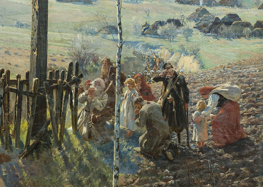 Obok klęczy inny starszy mężczyzna ubrany w białą sukmanę, pewnie mieszkaniec Dziemięrzyc. Dwie kobiety w czerwonych spódnicach i takich chustach, przybiegły pod krzyż z dziećmi. Niebożęta o płowych włoskach i anielskich twarzyczkach ubrane są jedynie w liche, białe koszuliny opadające poniżej kolan gołych i bosych nóg – serce się ściska, kiedy widzimy te małe, bose stópki stąpające po zimnym, kwietniowym błocie. Dołączył do nich stary wiarus – inwalida, który stracił lewą nogę kiedyś hen, na wojnie. Dziś, wsparty na kuli, jedynie modlitwą może wspomóc walczących rodaków.