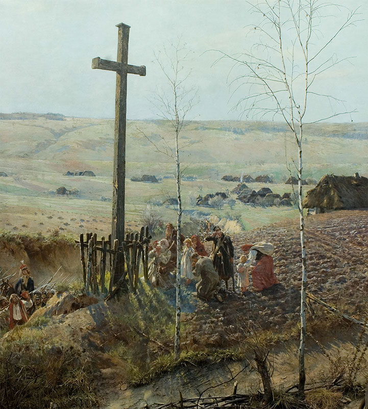 Na rozstajach dróg, z których jedna prowadzi do Dziemięrzyc (to ta odsadzona brzozami), a druga wiedzie do Janowiczek (ta w głębokim wąwozie) – ustawiono wysoki drewniany krzyż. Dla ochrony i podkreślenia sacrum otoczono go drewnianym płotkiem, widać dość dawno temu – mocowania sztachet i drągów poluzowały się, pokrzywiły. Pod krzyżem – niewielka grupka wieśniaków. Przybyli, by prosić Najwyższego o wspomożenie dla walczących w słusznej sprawie.